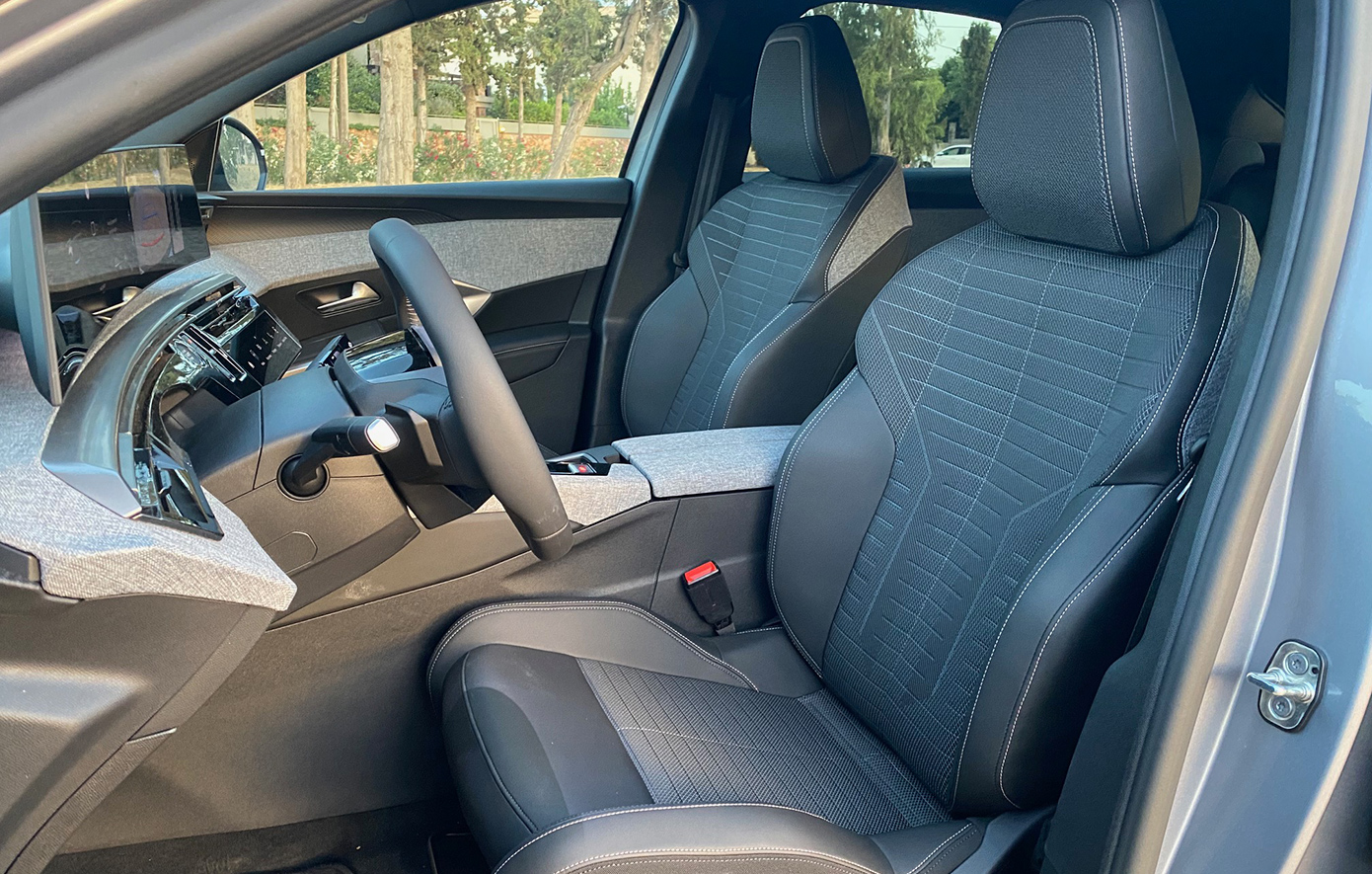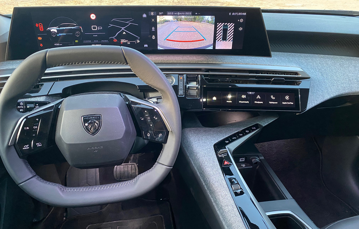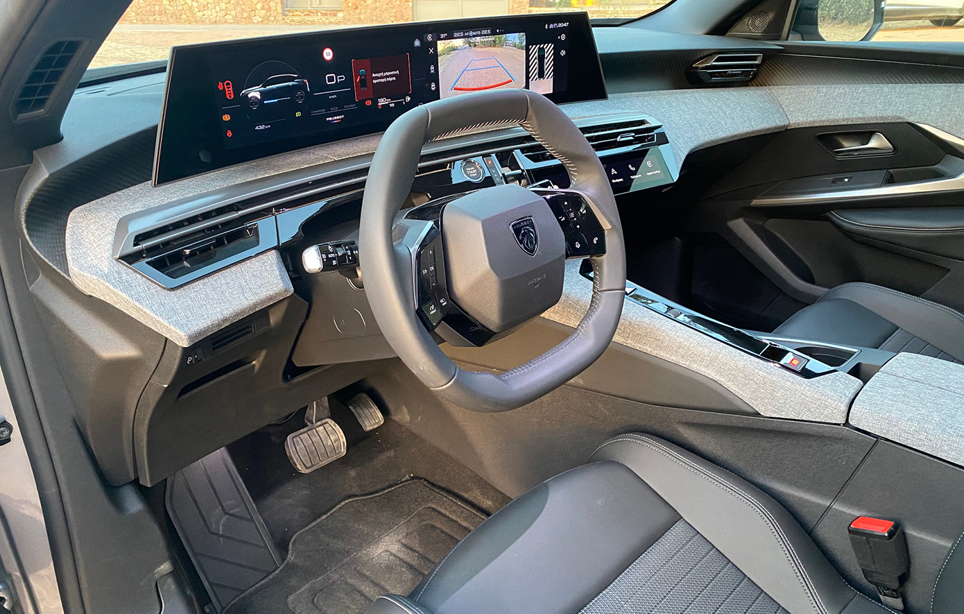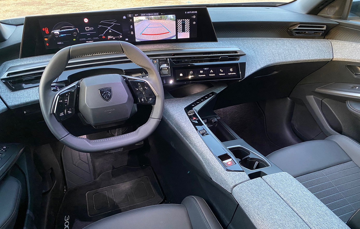 Στο εσωτερικό, η σχεδίαση, ο διάκοσμος και η ποιότητα υλικών-συναρμογής αφήνουν ελάχιστα περιθώρια κριτικής. Την ίδια ώρα η θέση οδήγησης με το μικρό τιμόνι που έχουν πλέον όλα τα Peugeot, είναι σαφώς καλύτερη αφού συνήθεις σωματότυποι μπορούν να ρυθμίσουν την θέση όπως πρέπει και ταυτόχρονα να βλέπουν τον ψηφιακό πίνακα οργάνων, που είναι τμήμα μια ενιαίας πανοραμικής οθόνης, την οποία μοιράζεται με την οθόνη πολυμέσων. Λίγο πιο κάτω, μια μικρότερη οθόνη εμφανίζει 10 διακόπτες αφής οι οποίοι ενεργοποιούν βασικές λειτουργίες του οχήματος, ενώ πιο κάτω, στην κεντρική κονσόλα υπάρχει μία ακόμα σειρά διακοπτών αφής.