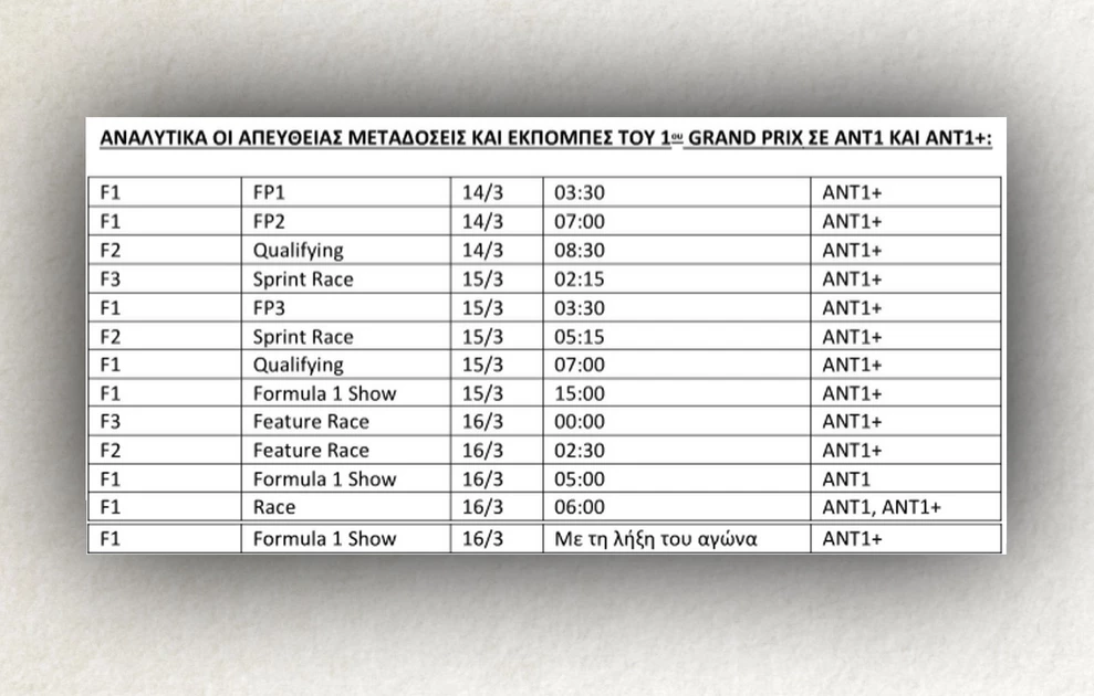 Αναλυτικά οι απευθείας μεταδόσεις & εκπομπές του 1ου Grand Prix σε ΑΝΤ1 & ΑΝΤ1+, έχουν ως εξής: