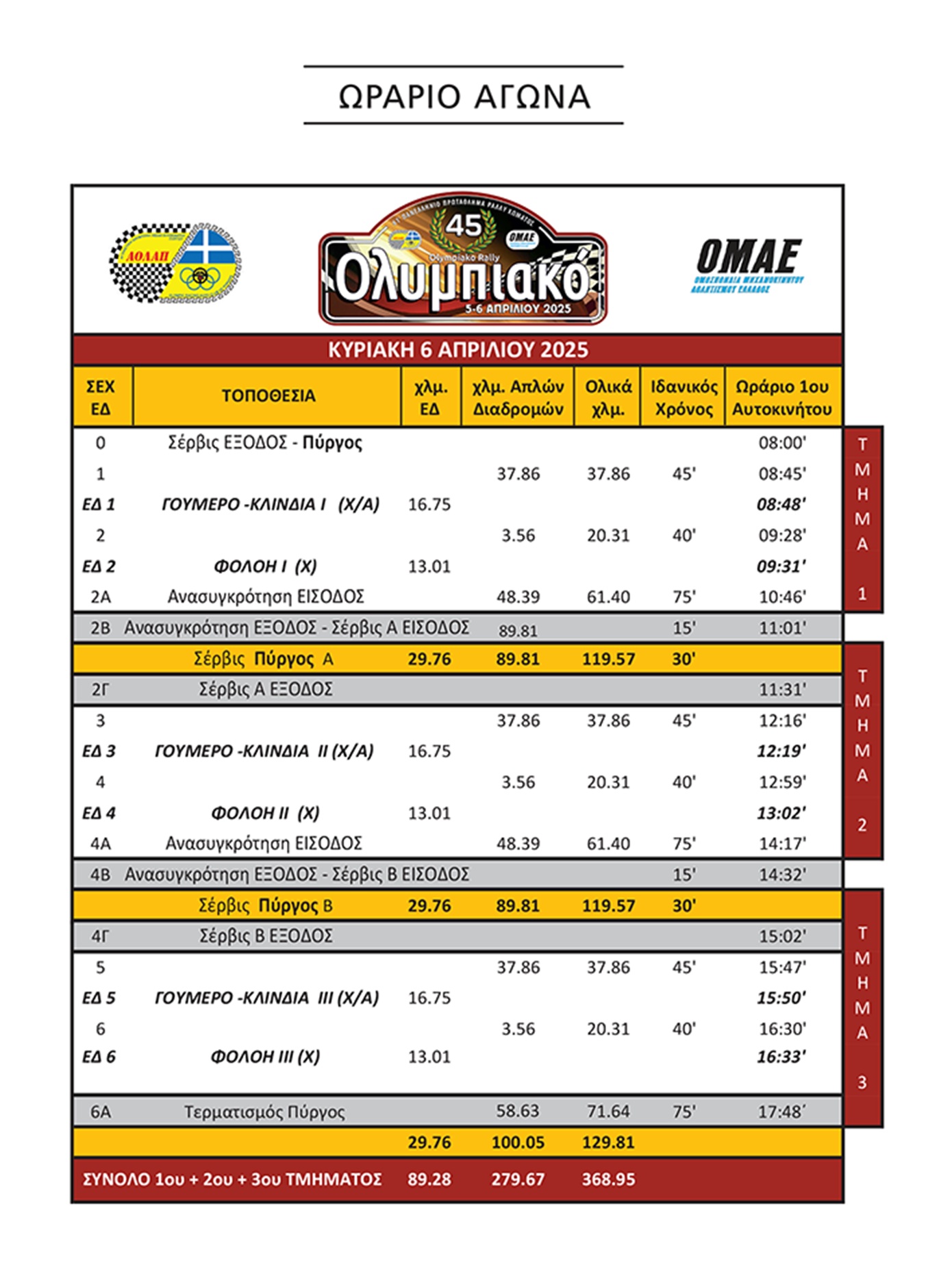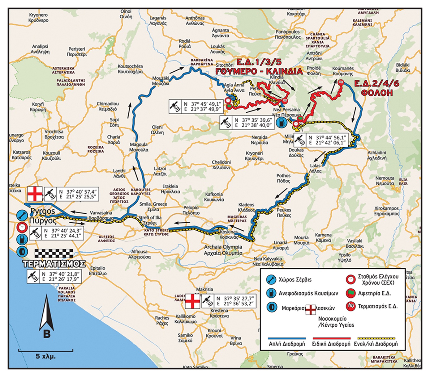 Η εκκίνηση του αγωνιστικού σκέλουςθα δοθεί την Κυριακή 6 Απριλίου στις 08.00 στην έξοδο του Service Park (Θεματικό Πάρκο Ξυστρή) και ο τερματισμός θα πραγματοποιηθεί στην Κεντρική Πλατεία Πύργου, Σάκη Καράγιωργα στις17:48 την ίδια ημέρα.