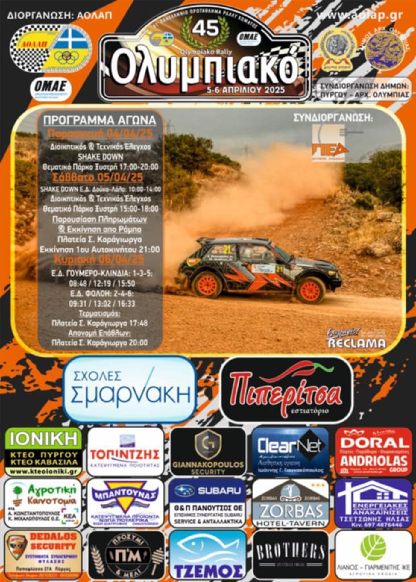 Με 43 συμμετοχές θα πραγματοποιηθεί η 45η έκδοση του Ολυμπιακού Ράλι το διήμερο 5 και 6 Απριλίου. Ο εναρκτήριος αγώνας του Πανελληνίου πρωταθλήματος Ράλι Χώματος θα έχει έδρα τον Πύργο Ηλείας καιδιοργανώνεται από το αθλητικό Σωματείο Αγωνιστική Ολυμπιακή Λέσχη Αυτοκινήτου Πύργου (ΑΟΛΑΠ), έχοντας ως συνδιοργανωτές την Π.Ε.Δ.Δ.Ε (Περιφερειακή Ένωση Δήμων Δυτικής Ελλάδος), τον Δήμο Πύργου και τον Δήμο Αρχαίας Ολυμπίας.