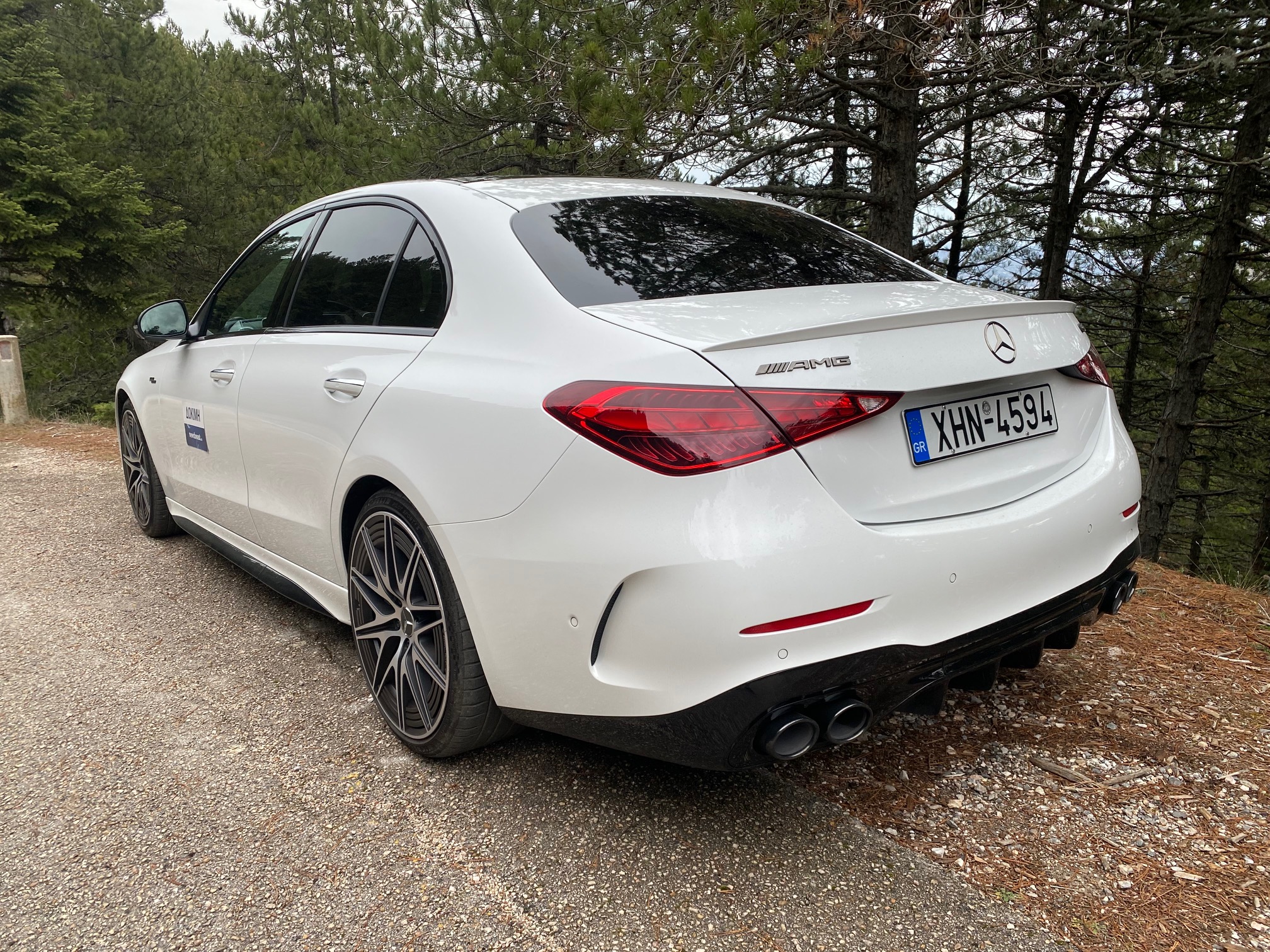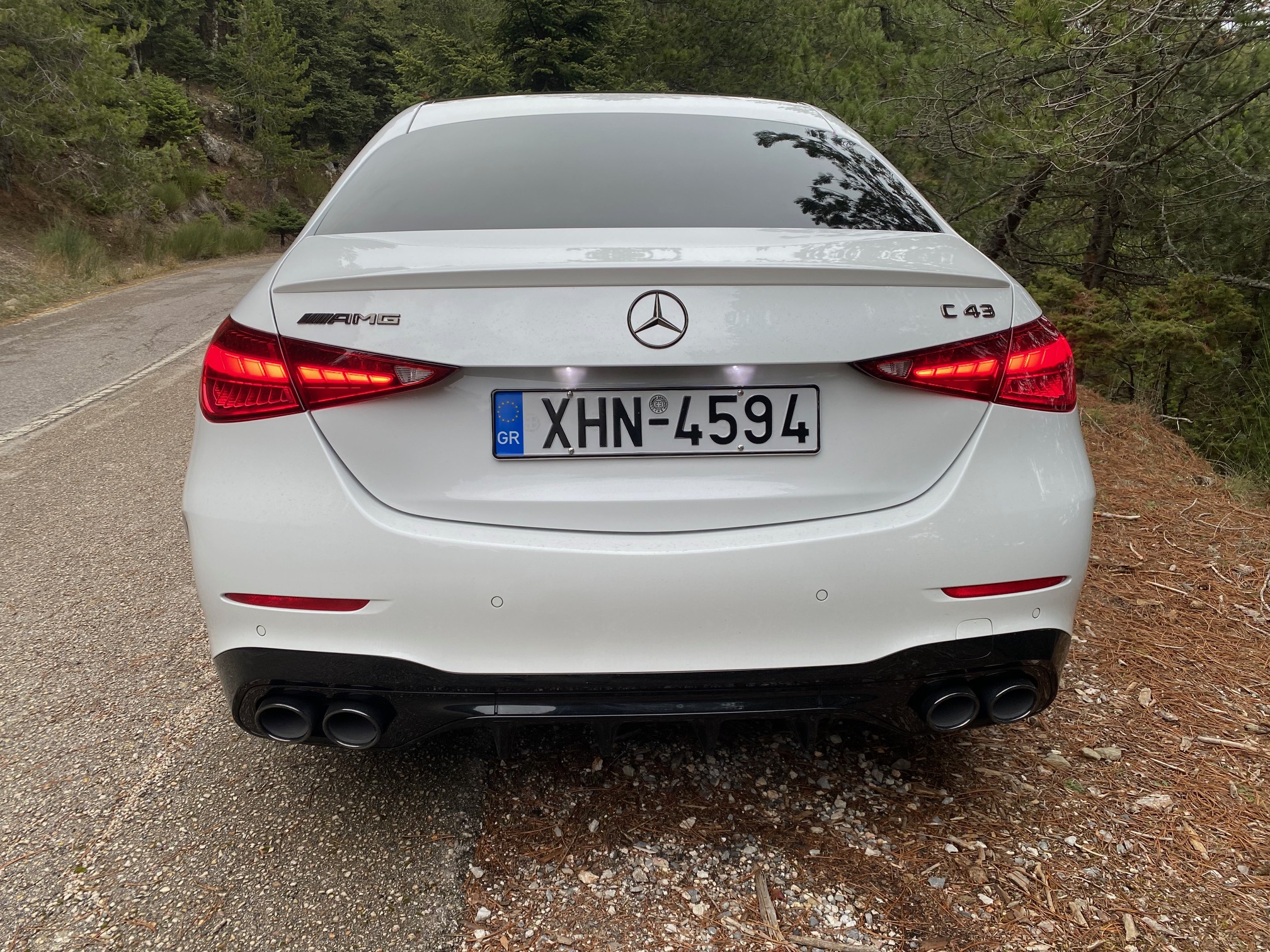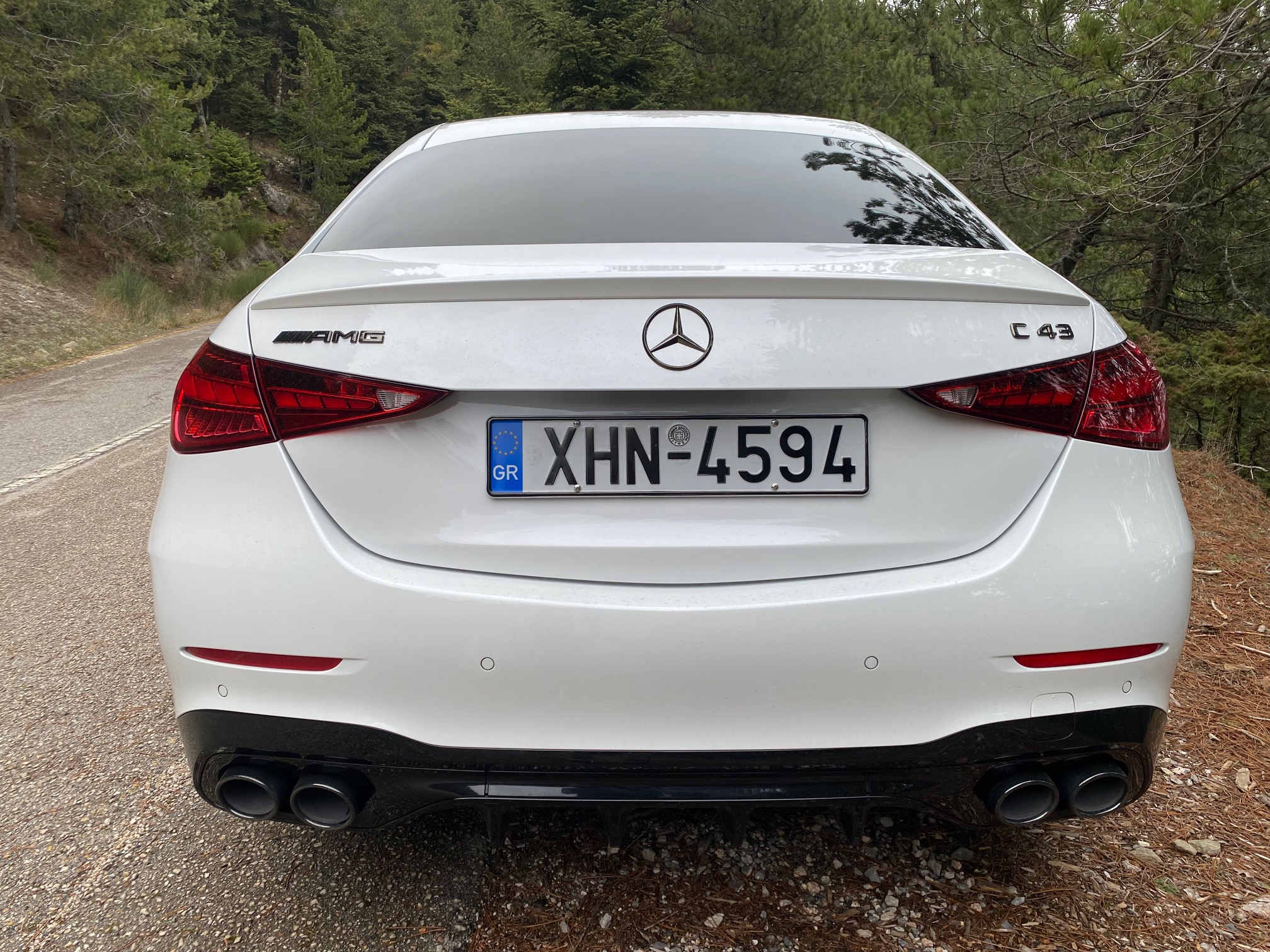 Στην περίπτωση της C43 που δοκιμάσαμε, η εξωτερική εμφάνιση δεν «βγάζει μάτια», με τα σημεία που προδίδουν τις επιδόσεις να περιορίζονται στους αεραγωγούς του εμπρός προφυλακτήρα, στις 20άρες ζάντες, τα πλαϊνά skirts, τον διαχύτη στον πίσω προφυλακτήρα και τις 4 μπούκες της εξάτμισης. Επιπλέον, οι με καλή όραση και παρατηρητικότητα, θα εντοπίσουν τα σηματάκια “Turbo Electrified” στα εμπρός φτερά.