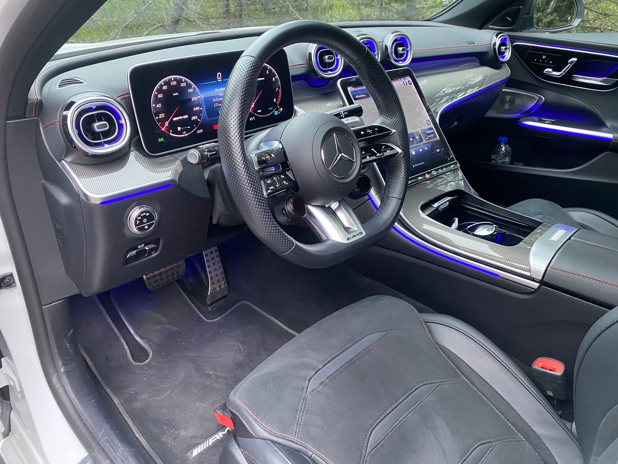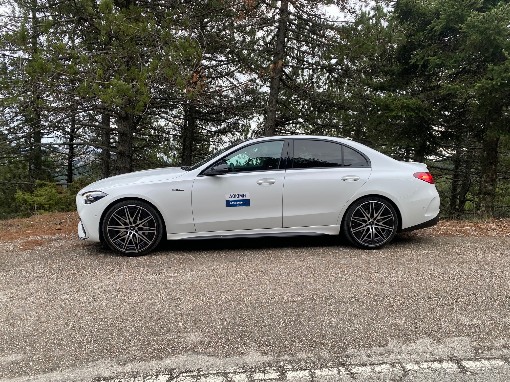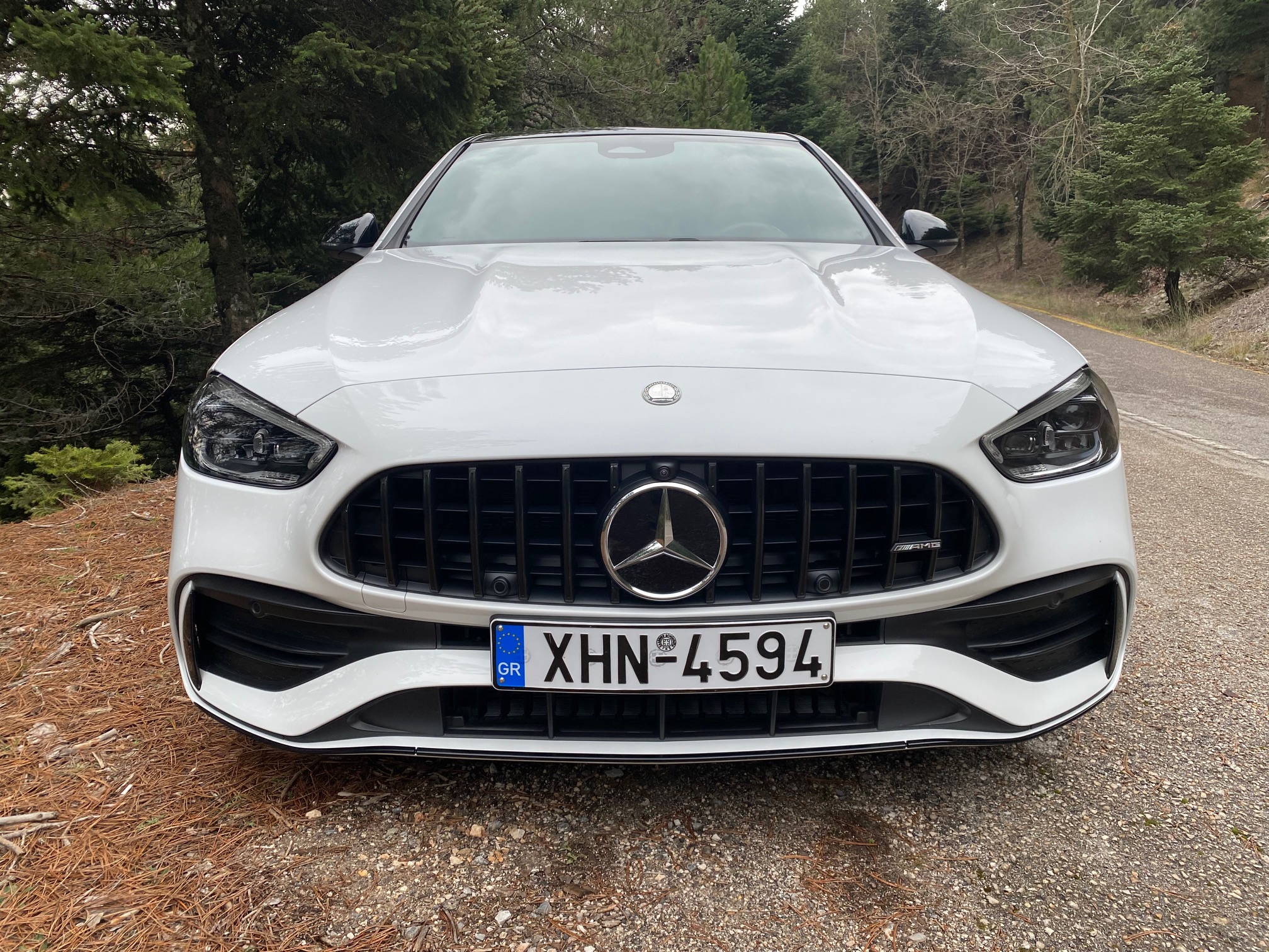 Στην περίπτωση της C43 που δοκιμάσαμε, η εξωτερική εμφάνιση δεν «βγάζει μάτια», με τα σημεία που προδίδουν τις επιδόσεις να περιορίζονται στους αεραγωγούς του εμπρός προφυλακτήρα, στις 20άρες ζάντες, τα πλαϊνά skirts, τον διαχύτη στον πίσω προφυλακτήρα και τις 4 μπούκες της εξάτμισης. Επιπλέον, οι με καλή όραση και παρατηρητικότητα, θα εντοπίσουν τα σηματάκια “Turbo Electrified” στα εμπρός φτερά.