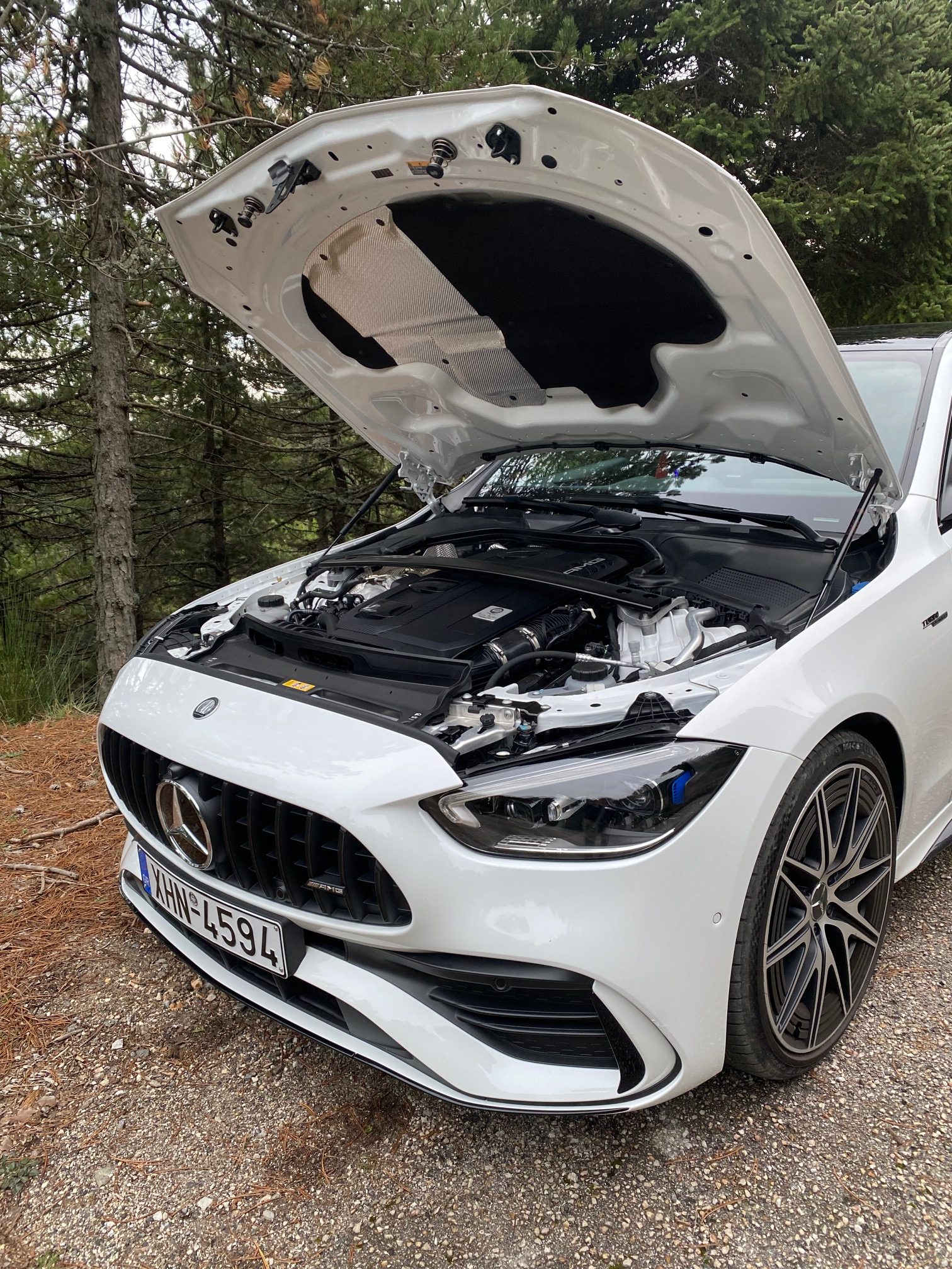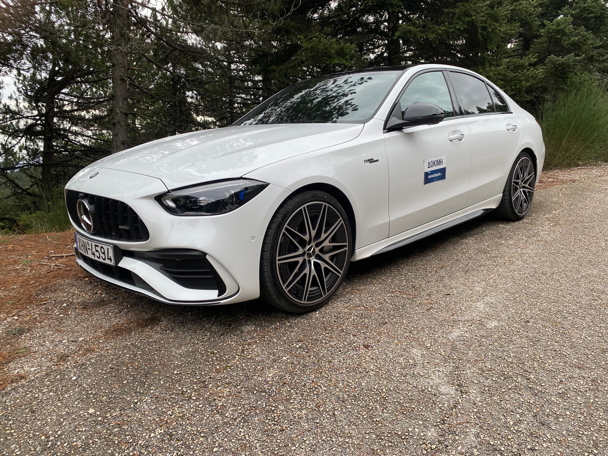 Η AMG C43 της δοκιμής μας σε αντίθεση με τα μέχρι τώρα δεδομένα (η προηγούμενη C43 χρησιμοποιούσε V6, 3λιτρο κινητήρα, 390 ίππων), κινείται από ένα συμπαγές, ήπια υβριδικό, 4κύλινδρο σύνολο, 1.991 κ.εκ., που αποδίδει 421 ίππους και 500 Nm ροπής (μόλις 20 λιγότερα από τον 6κύλινδρο κινητήρα), συμπεριλαμβανομένου και ενός εγκάρσια εμπρός τοποθετημένου ηλεκτροκινητήρα διαμέτρου περίπου 4 εκατοστών (13 ίππων).