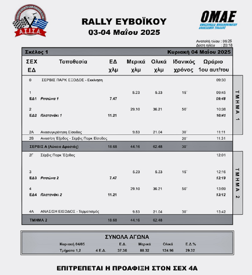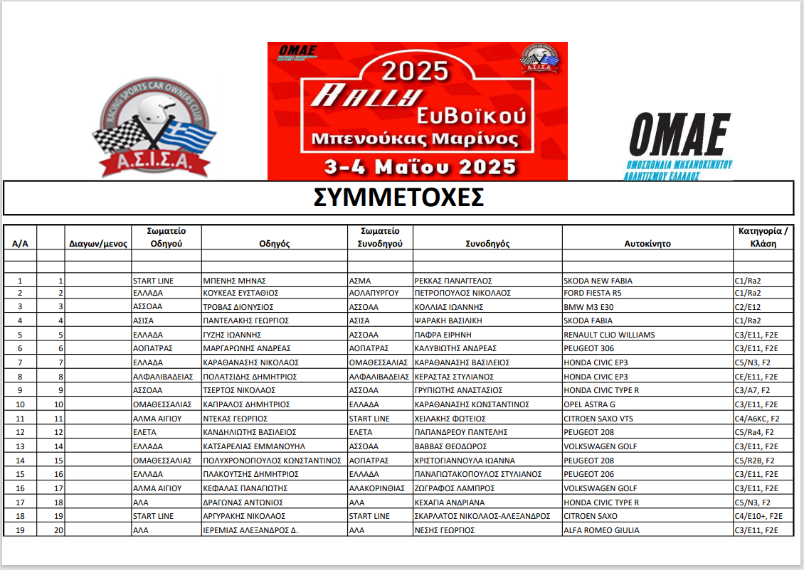Ο Διοικητικός και Τεχνικός Έλεγχος του Ράλι Ευβοϊκού «Μαρίνος Μπενούκας» θα διεξαχθεί το Σάββατο 3 Μαΐου από τις 14:30 έως τις 18:30 στις εγκαταστάσεις του Λυκείου Δροσιάς Χαλκίδας, ενώ την Κυριακή, το πρώτο αγωνιστικό αυτοκίνητο θα αναχωρήσει από το Service Park στις 09:30, προκειμένου να αγωνιστεί στην πρώτη ειδική διαδρομή του αγώνα, τη Ριτσώνα (09:48), μήκους 7.47 χλμ. Στη συνέχεια, τα πληρώματα θα αγωνιστούν στο Πλατανάκι (10:41), μήκους 11,21 χλμ. και θα επιστρέψουν στο Service Park στη Δροσιά Χαλκίδας για 30λεπτο Service. Έπειτα, θα κατευθυνθούν και πάλι για το δεύτερο πέρασμα από τις ειδικές διαδρομές Ριτσώνα (12:19) και Πλατανάκι (13:12). Οι απονομές θα πραγματοποιηθούν στο Λύκειο Δροσιάς Χαλκίδας την Κυριακή 4 Μαΐου στις 16:30.