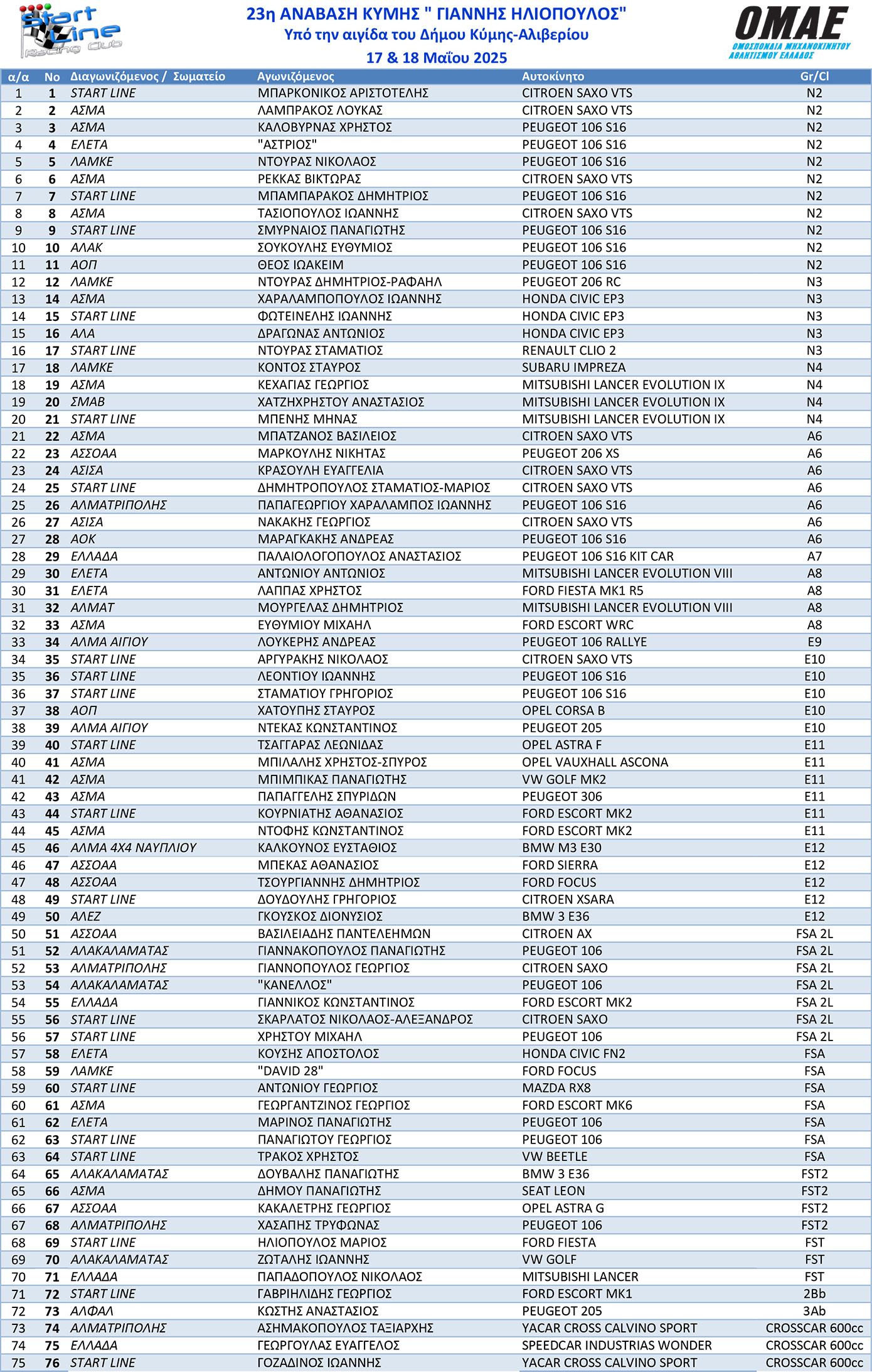 Αναλυτικά, στην κατηγορία Ν δήλωσαν συμμετοχή 20 αγωνιζόμενοι, στην κατηγορία Α εκδήλωσαν ενδιαφέρον 12 οδηγοί, στην κατηγορία Ε θα συμμετάσχουν 17 αθλητές και στην Formula Saloon έχουμε 21 συμμετοχές. Επίσης, θα δούμε δυο συμμετοχές Ιστορικών και 16 συμμετοχές στην Crosscar, ενώ 14 οδηγοί Drift θα ξεσηκώσουν τους θεατές με ατελείωτες πλαγιολισθήσεις στις 52 στροφές της ανάβασης.