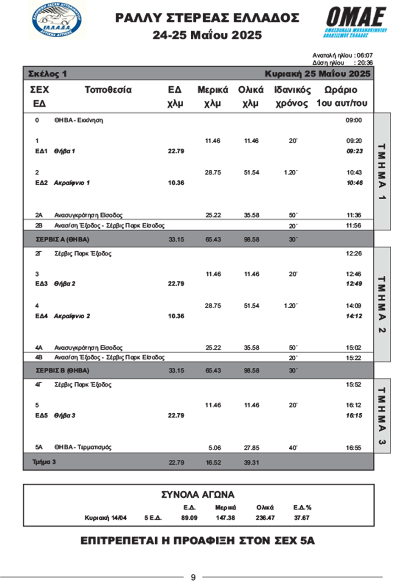 Power Stage του αγώνα, θα είναι η Ειδική Διαδρομή «Θήβα», στην οποία το πρώτο αγωνιστικό θα εκκινήσει στις 16:15. Ο τερματισμός του αγώνα θα πραγματοποιηθεί στις 16:55 στο Μουσικό Ωδείο Θήβας, ενώ στην Πλατεία Κεραμοπούλου, έμπροσθεν του Μουσείου της πόλης, θα λάβουν χώρα οι απονομές στις 18:30. Το συνολικό μήκος του αγώνα είναι 236,47 χλμ, από τα οποία τα 89.09 χλμ. αφορούν τις 5 ειδικές διαδρομές.