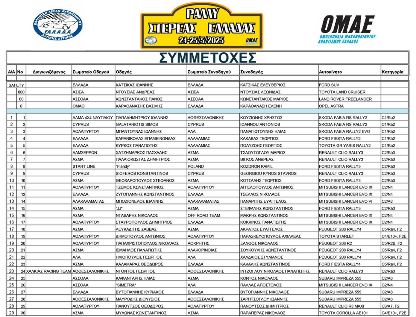 Δημοσιεύτηκε ο πίνακας συμμετοχών του Ράλι Στερεάς Ελλάδας (Οργανωτής είναι το Σωματείο «Ελληνική Λέσχη Αυτοκινήτου Δυτικής Αττικής»), ο οποίος περιλαμβάνει φέτος 72 πληρώματα, τον μεγαλύτερο αριθμό σε πρωταθληματικό χωμάτινο αγώνα από το 2008 μέχρι σήμερα.