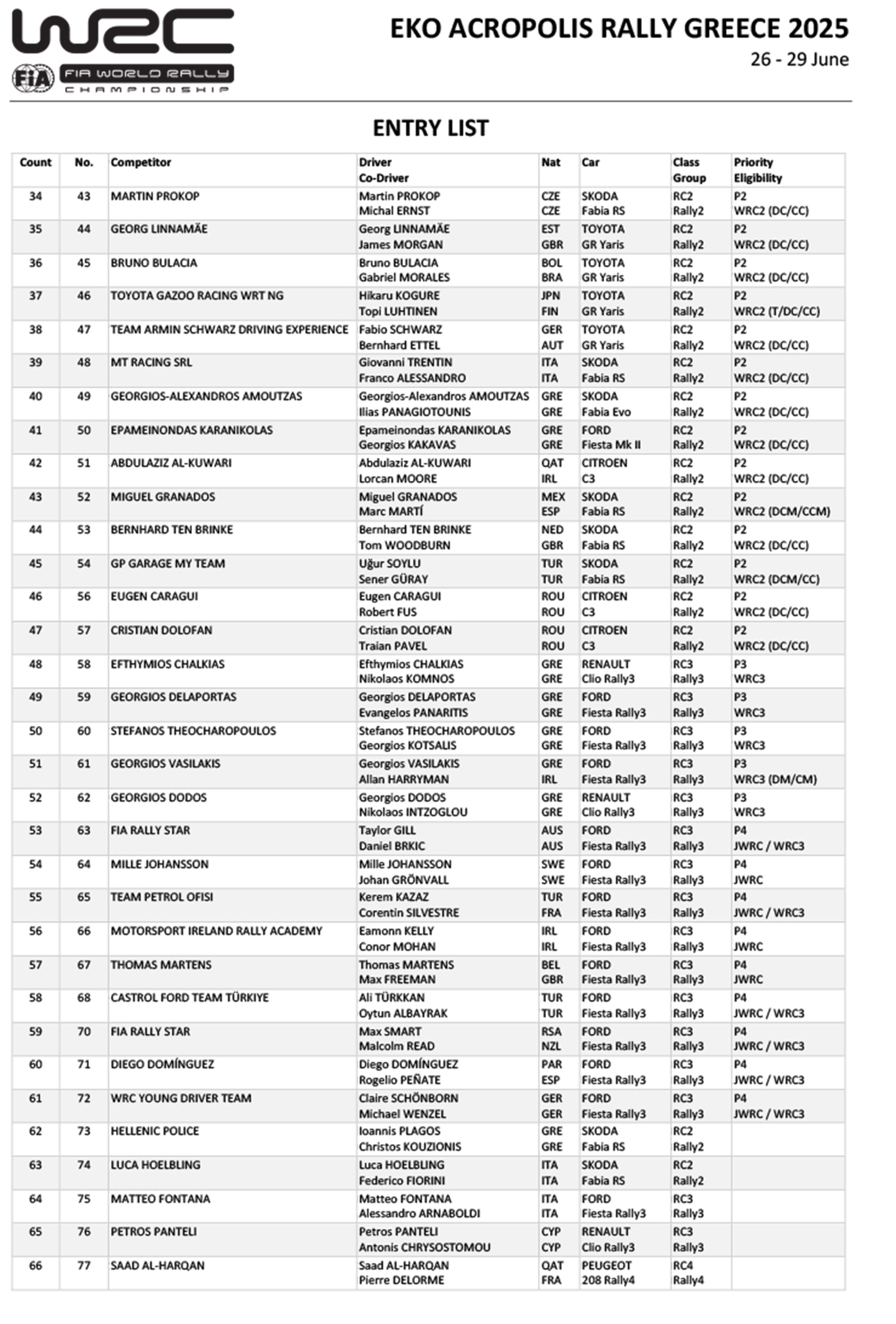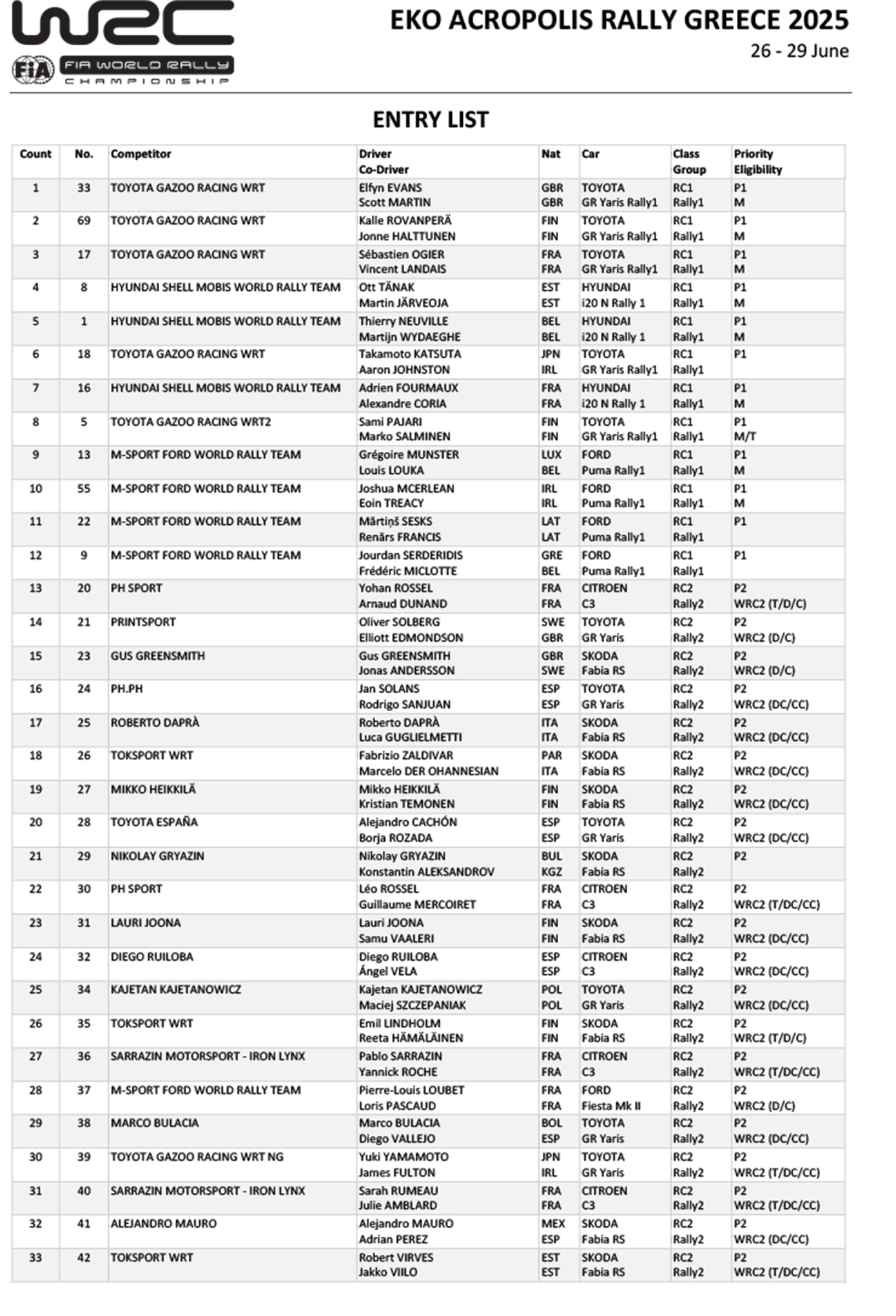 Πίσω από τα Rally1, ο ανταγωνισμός στο WRC2 προμηνύεται σκληρός. Ανάμεσα σε συνολικά 37 αυτοκίνητα προδιαγραφών Rally2, οι Yohan Rossel (Citroen C3) και Oliver Solberg (Toyota GR Yaris) συνεχίζουν τη μάχη κορυφής, με τους Gus Greensmith (Skoda Fabia RS) και Jan Solans (Toyota GR Yaris) να διεκδικούν το χαμένο έδαφος.