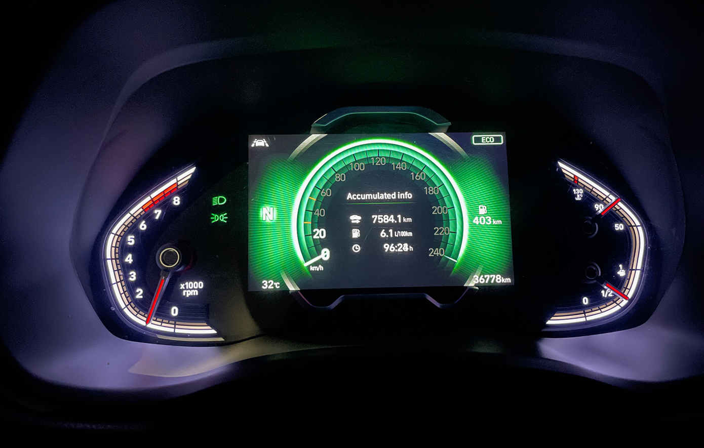 Επιπλέον, το υβριδικό σύστημα και συγκεκριμένα η γεννήτρια εκκίνησης που είναι συνδεδεμένη μέσω ιμάντα στο στροφαλοφόρο άξονα, δίνει έως και 16 ίππους επιπλέον κατά την επιτάχυνση κάτι που σε συνδυασμό με τη λειτουργία sailing του κιβωτίου (αποσυνδέει τον κινητήρα από το σύστημα μετάδοσης όταν ο οδηγός αφήνει το γκάζι), μειώνει την κατανάλωση καυσίμου σε επίπεδα μικρού ντιζελοκινητήρα. Κάπως έτσι η μέση κατανάλωση που έχουμε στα χιλιάδες χιλιόμετρα που διανύσαμε ήταν μόνο 6,1 λίτρα/ 100 χιλιόμετρα, τιμή που επιτρέπει αυτονομία 800+ χιλιομέτρων με ένα ρεζερβουάρ βενζίνης (50 λίτρα).