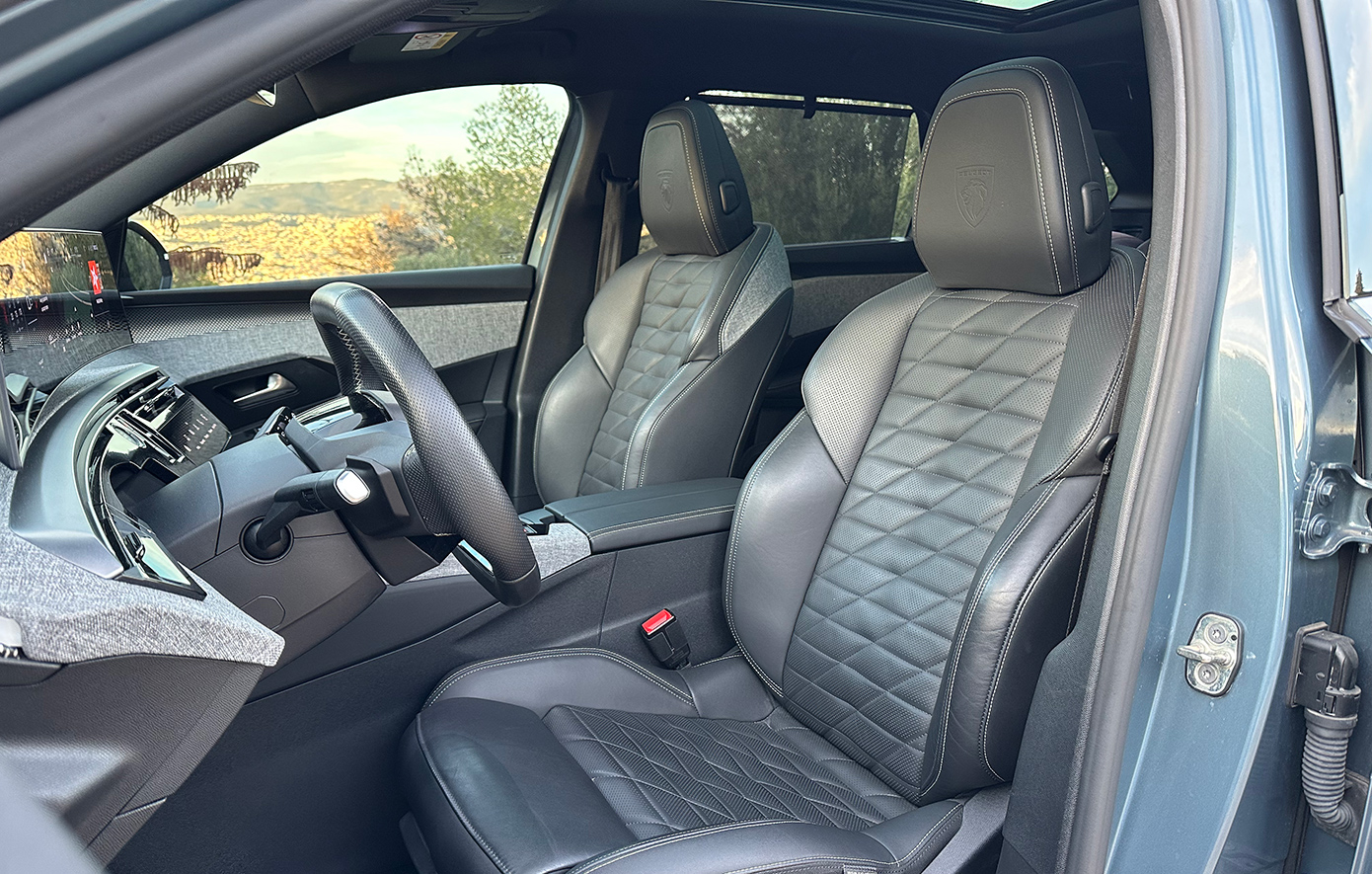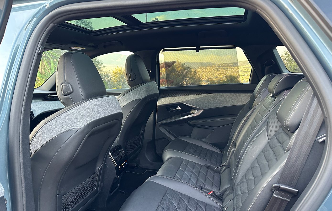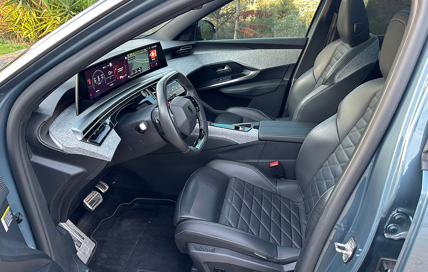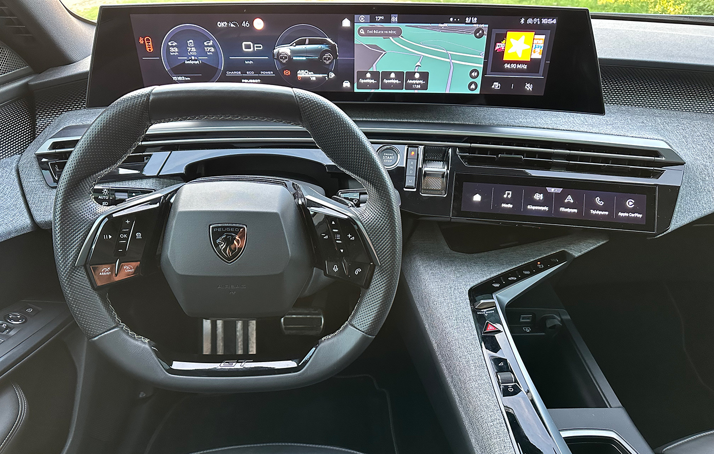 Στο εσωτερικό αντιλαμβάνεσαι από την πρώτη ματιά πως αυτό το αυτοκίνητο έχει δημιουργηθεί για να παρέχει σχεδόν τα πάντα. Το εσωτερικό του είναι ξεκάθαρα premium και συγχρόνως τόσο high tech όσο απαιτεί η εποχή μας. Στο ταμπλό δεσπόζει το Panoramic i-Cockpit, που είναι ένα από τα καλύτερα και πιο πρωτοποριακά infotainment της αγοράς. Ταυτόχρονα, το κυρτό πάνελ 21 ιντσών καλύπτει το μισό ταμπλό, δίνοντας την αίσθηση μιας αιωρούμενης κονσόλας, κάτι που ενισχύει ο LED φωτισμός του εσωτερικού κάτω από την οθόνη. Η τελευταία, τοποθετημένη για βέλτιστη εργονομία, είναι στραμμένη προς τον οδηγό, ενώ παραμένει απόλυτα προσβάσιμη και από τον συνοδηγό. Αριστερά, πάνω από το μικρό τιμόνι, η οθόνη περιλαμβάνει όλες τις πληροφορίες οδήγησης: ταχύτητα, μετρητή ισχύος, συστήματα υποβοήθησης οδήγησης, ροή ενέργειας κ.λπ. Δεξιά, στο κέντρο του ταμπλό, από την οθόνη αφής, ο χρήστης ελέγχει τα συστήματα θέρμανσης και κλιματισμού, πλοήγησης, πολυμέσων και συνδεσιμότητας. Όλα ελέγχονται με μεγάλη ευκολία, κάτι το οποίο αποτελεί το μεγάλο πλεονέκτημα του συστήματος πολυμέσων της Peugeot, ενώ θετική είναι η παρουσία μερικών φυσικών διακοπτών.