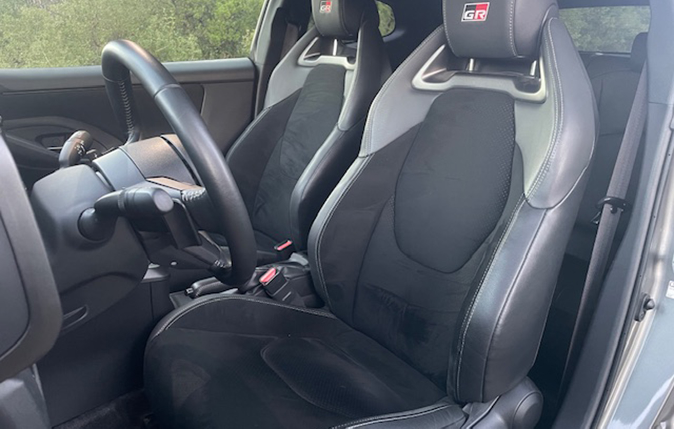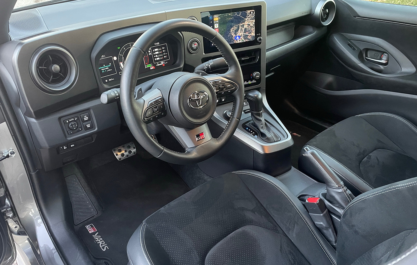Παρά το μακρύ μεταξόνιο, τα φαρδιά μετατρόχια κάνουν το Yaris GR να μοιάζει τετράγωνο και ευρύχωρο, αλλά αυτό δεν μεταφράζεται σε άνετους χώρους. Ευνοούμενοι σαφώς οι εμπρός επιβάτες, αλλά πίσω η κλειστοφοβική αίσθηση και η δύσκολη πρόσβαση, κάνει την χρήση του αυτοκινήτου ουσιαστικά σαν διθέσιου.