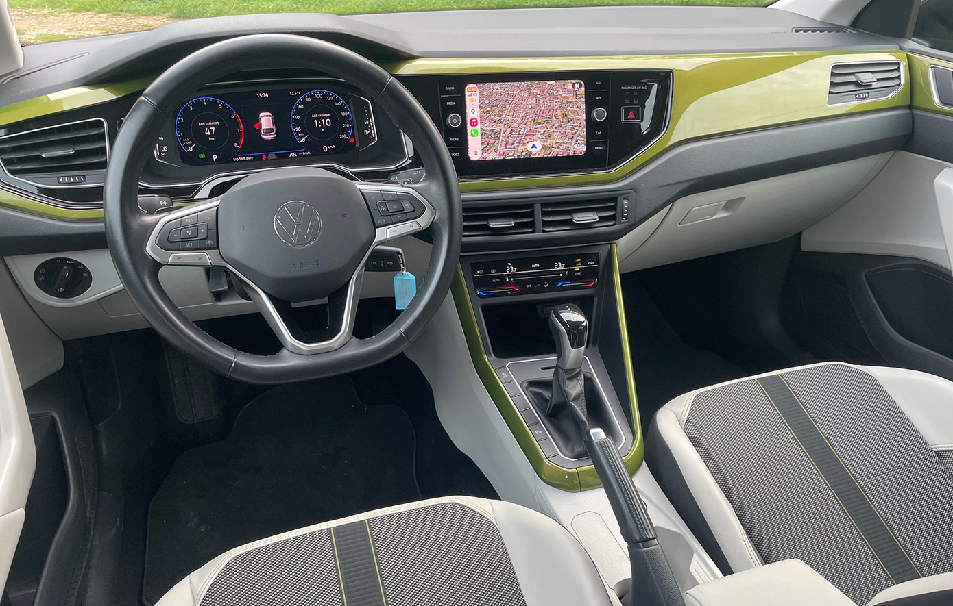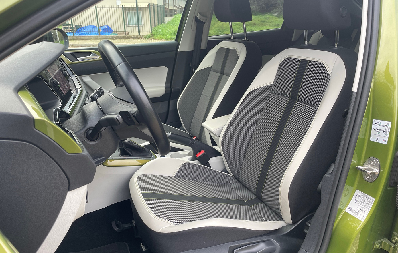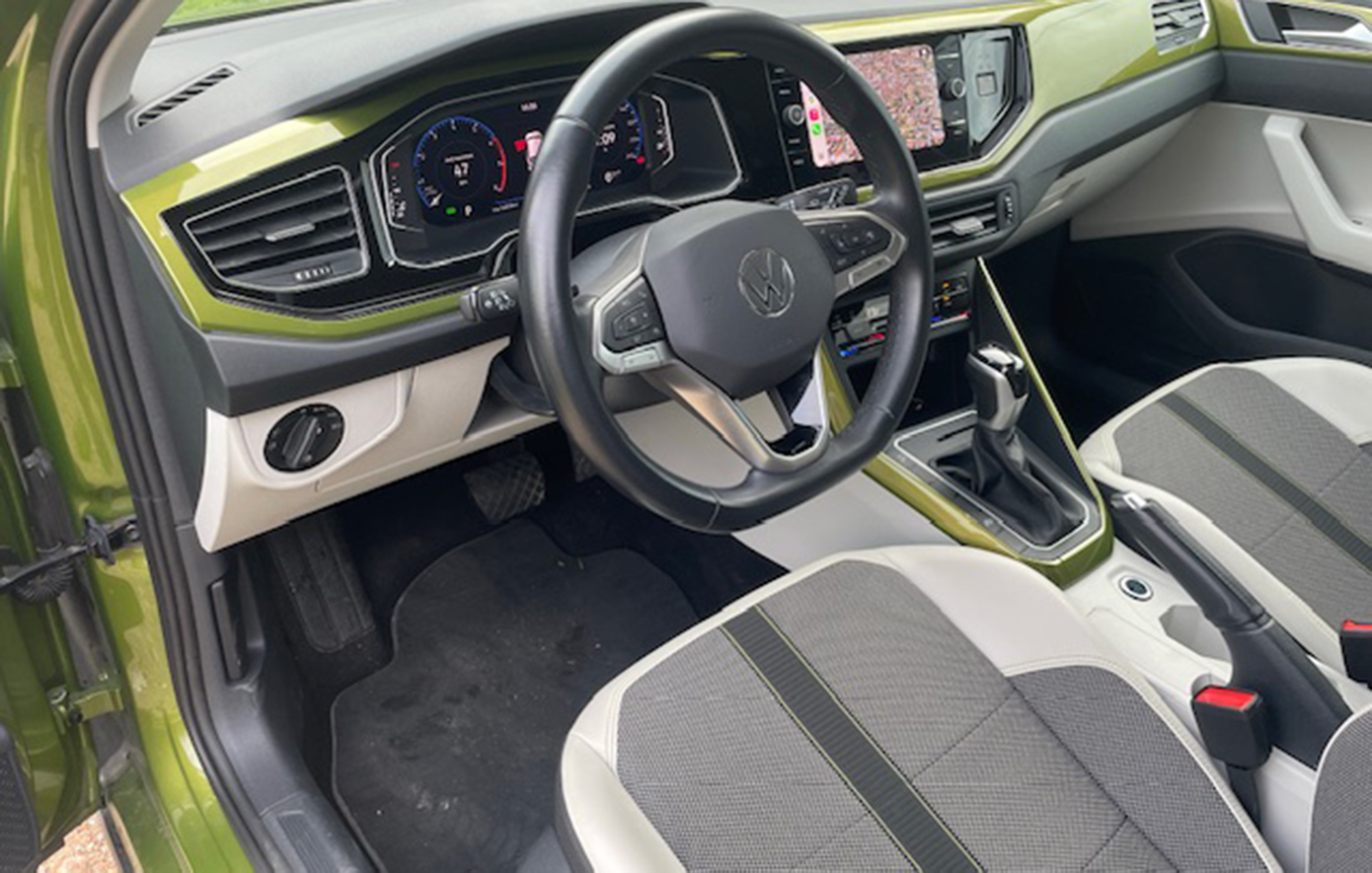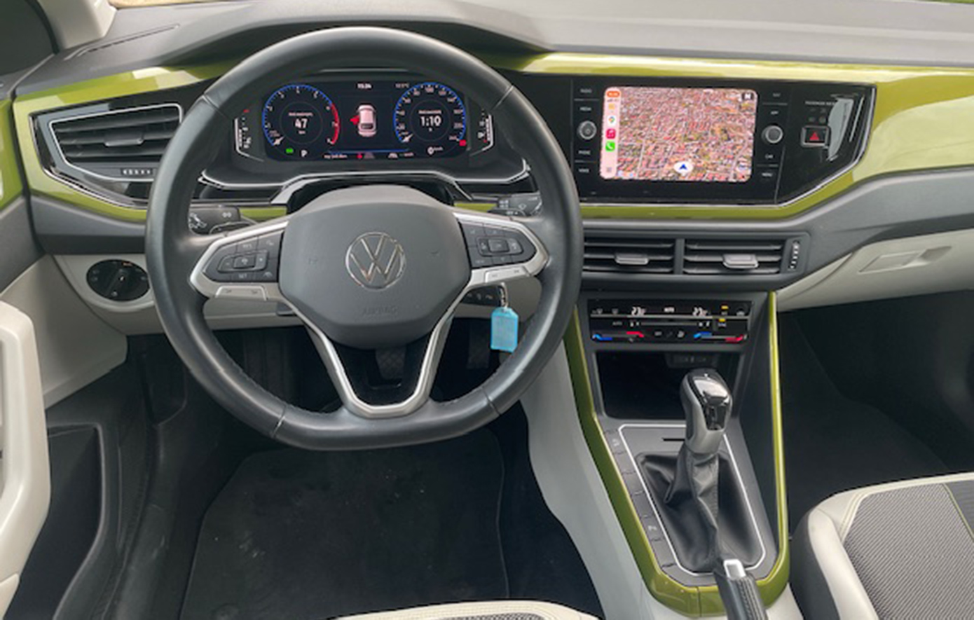Το σχεδιαστικά τυπικό Volkswagen εσωτερικό, διαθέτει ψηφιακό πίνακα οργάνων, οθόνη αφής στο κέντρο, ελάχιστους φυσικούς διακόπτες και πολλές θέσεις για μικροαντικείμενα. Η καλή ποιότητα συναρμογής και το προσεγμένο φινίρισμα, δείχνουν ανθεκτικά στον χρόνο και δημιουργούν ευχάριστη ατμόσφαιρα, ενώ η εργονομία δεν προβληματίζει, με εξαίρεση την ορατότητα προς τα πίσω που απαιτεί κάμερα οπισθοπορείας (υπάρχει στην έκδοση Style που οδηγήσαμε). Η έκδοση αυτή διαθέτει πλούσιο εξοπλισμό ασφάλειας και άνεσης, περιλαμβάνοντας – μεταξύ άλλων – προβολείς LED Matrix «IQ.Light», cruise control, σύστημα διατήρησης λωρίδας, αυτόματο φρενάρισμα και αισθητήρες παρκαρίσματος εμπρός-πίσω. Επίσης, το Digital Cockpit προσφέρει δυνατότητες παραμετροποίησης και η κεντρική οθόνη υποστηρίζει Apple CarPlay και Android Auto.