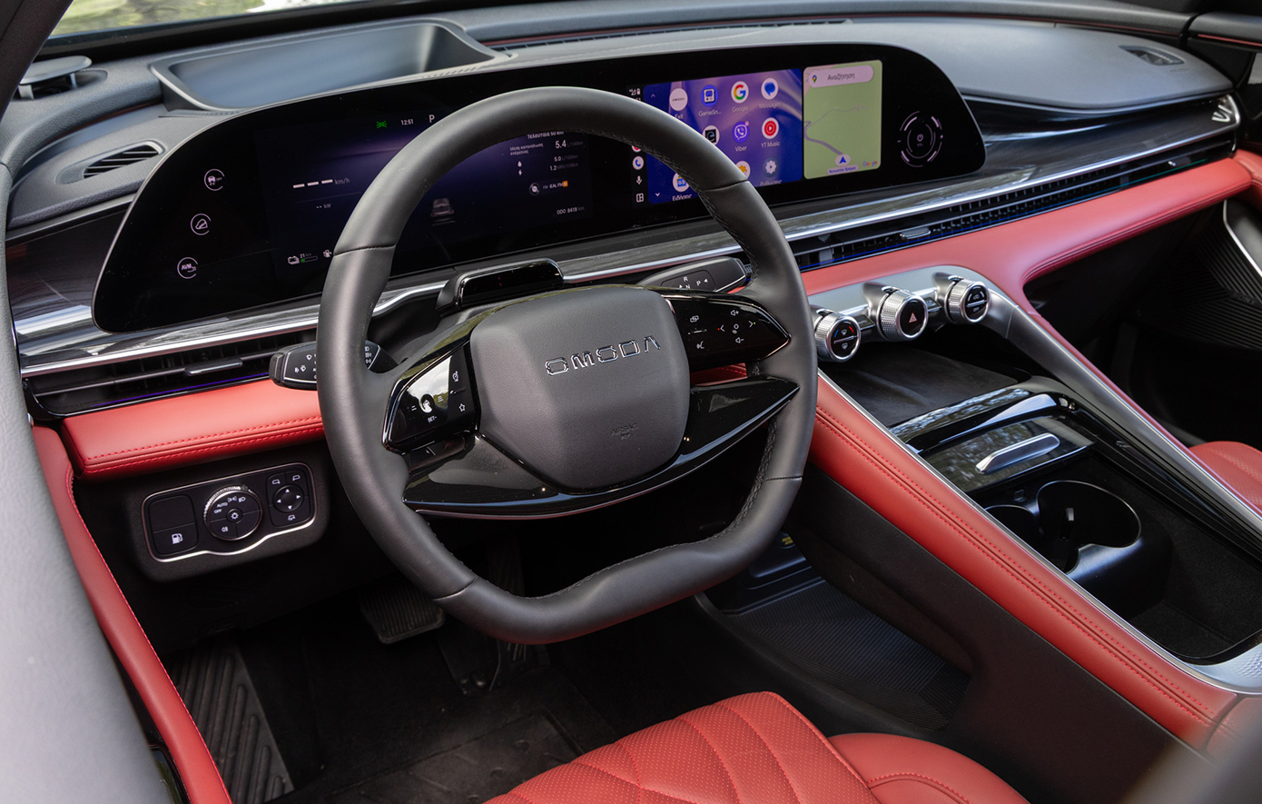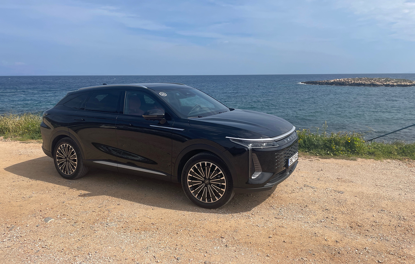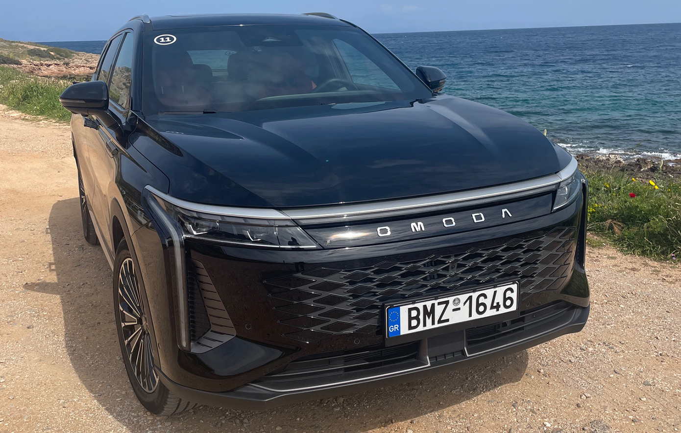 Στη διάρκεια της παρουσίασης είχαμε την ευκαιρία να οδηγήσουμε τη ναυαρχίδα της μάρκας Omoda, που ακούει στο όνομα Omoda 9 SHS-P AWD. Πρόκειται για ένα 5θυρο επιβατικό όχημα της κατηγορίας D-SUV (μήκος 4,775μ.), με το καινοτόμο κινητήριο σύστημα Super Hybrid System (SHS). Το σύστημα συνδυάζει έναν θερμικό κινητήρα 1.5 TGDi βενζίνης με ισχυρή μπαταρία υψηλής χωρητικότητας (34,46kWh) και τρεις ηλεκτροκινητήρες, προσφέροντας συνολική συνδυαστική ισχύ έως 537 ίππους και 650 Nm ροπής. Η τετρακίνηση i-AWD με προσαρμοζόμενη κατανομή ροπής, κατευθύνει την κίνηση σε εμπρός ή πίσω άξονα ανάλογα με τις συνθήκες, για μέγιστη πρόσφυση και ασφάλεια σε κάθε συνθήκη. Το σύστημα αυτό αξιοποιεί δύο ηλεκτρικούς κινητήρες στον εμπρός άξονα και έναν ισχυρό ηλεκτροκινητήρα στον πίσω, εξασφαλίζοντας σταθερή συμπεριφορά, ακόμη και σε απαιτητικές καταστάσεις οδήγησης.