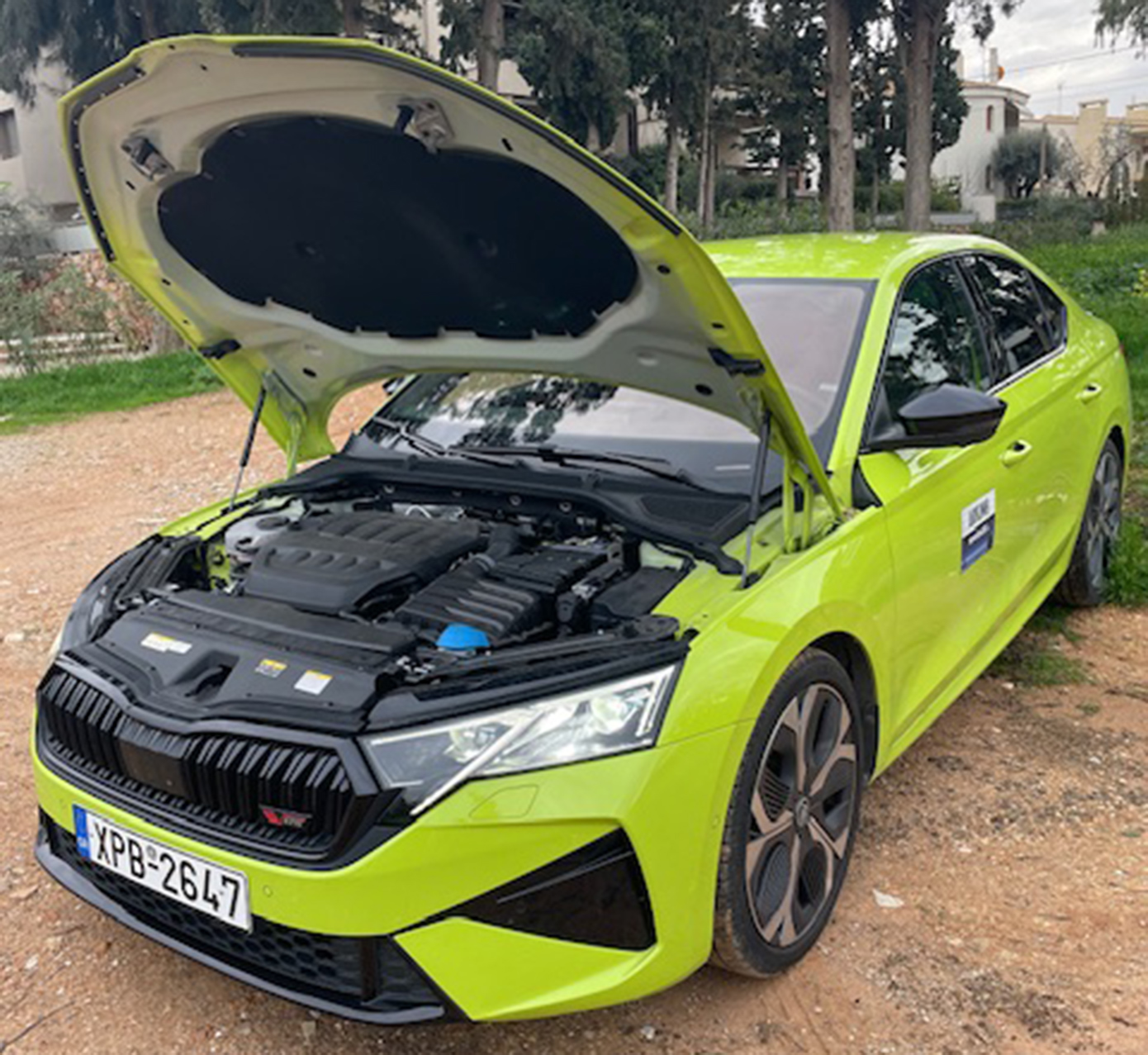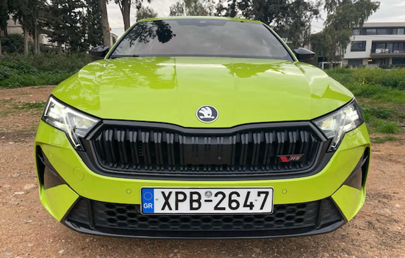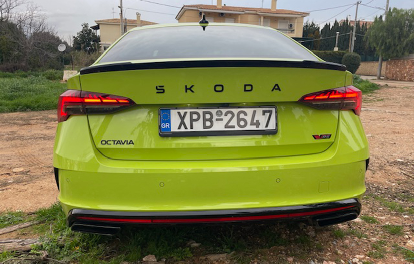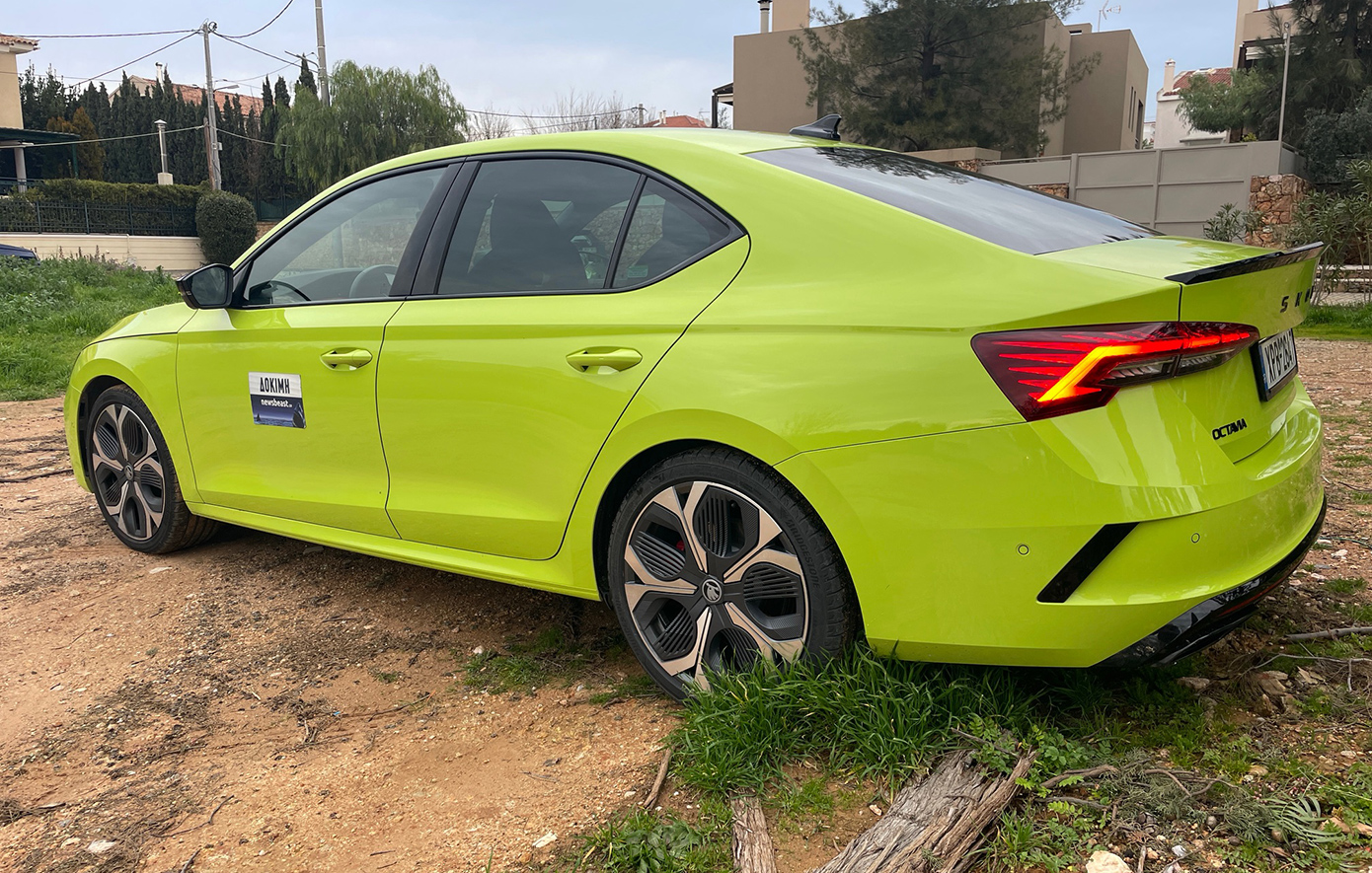 Το Octavia Grand Coupé RS της δοκιμής μας ανήκει στην 4η γενιά του μοντέλου, γυρίζει την πλάτη στις διεθνείς τάσεις εξηλεκτρισμού έχοντας ένα αμιγώς θερμικό 2λιτρο κινητήρα βενζίνης (TSI) και είναι βαμμένο σε χρώμα που βγάζει… μάτια (Mamba Green).