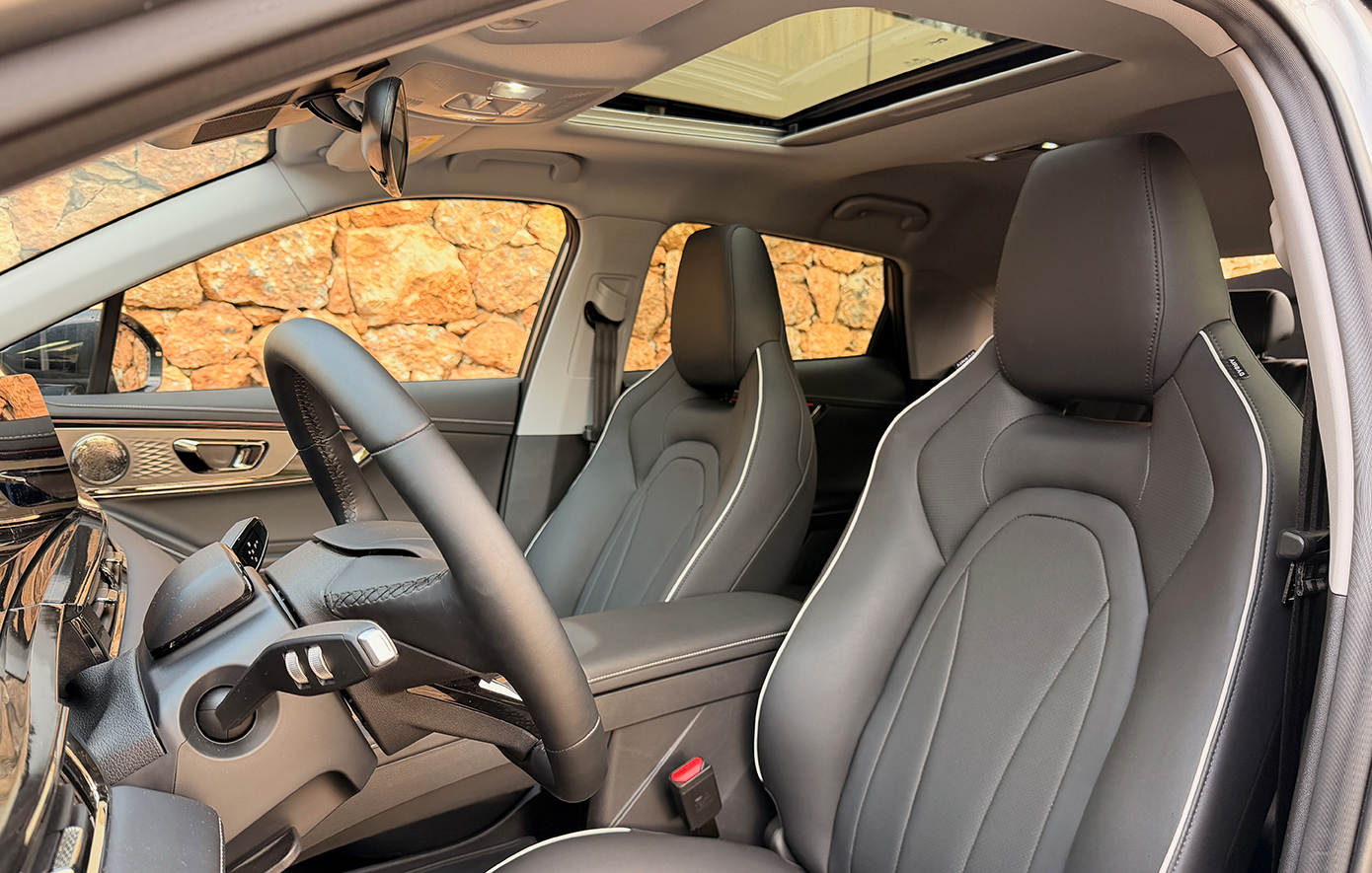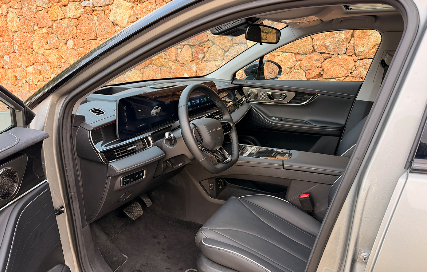Ποιοτικά υλικά, άψογα συναρμολογημένα, συνθέτουν ένα εσωτερικό που δεν έχει σε τίποτα να ζηλέψει από τα premium μοντέλα της αγοράς. Ταυτόχρονα, το πλεόνασμα τεχνολογίας των Κινέζων είναι εμφανές και μέσω των δυο μεγάλων ψηφιακών οθονών (12.3΄΄) που απεικονίζουν τα όργανα και τις λειτουργίες του συστήματος πολυμέσων. Η οθόνη αφής πολυμέσων είναι ευανάγνωστη, έχει γρήγορη απόκριση και εύχρηστο μενού, αλλά δεν υποστηρίζεται από φυσικούς διακόπτες, με όποιο κίνδυνο δυσλειτουργίας αυτό συνεπάγεται. Πάντως, το σύστημα υποστηρίζει ασύρματη σύνδεση Apple CarPlay και Android Auto, ενώ διατίθεται αυτόματος διζωνικός κλιματισμός, ασύρματη φόρτιση κινητού, κάμερα οπισθοπορείας, κ.ά. Επιπλέον, στον βασικό εξοπλισμό περιλαμβάνονται 23 τεχνολογίες ασφάλειας και , υποβοήθησης οδηγού, που βοήθησαν στην απόκτηση των πέντε αστεριών στις δοκιμές πρόσκρουσης του EuroNCAP.