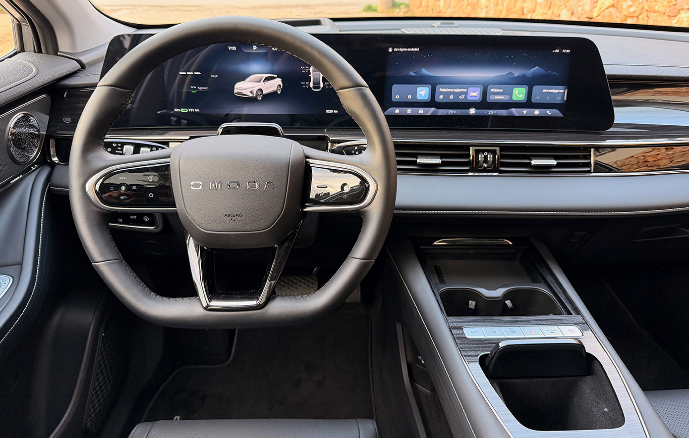 Από την υπερυψωμένη θέση του οδηγού, έχεις καλή περιφερειακή ορατότητα, με μικρό πρόβλημα στις πίσω γωνίες, όπου οι φαρδιές κολώνες δημιουργούν τυφλά σημεία, τα οποία έρχεται να «φωτίσει» η ευκρινέστατη κάμερα οπισθοπορείας. Η καλή πλευρική στήριξη και η χωρίς προβλήματα εργονομία, διευκολύνουν τον οδηγό, ο οποίος έχει μπροστά του ένα επιλογέα ταχυτήτων τύπου Mercedes (στην κολώνα του τιμονιού). Τοποθετώντας τον στην θέση D (Drive), το Omoda 5 ξεκινά και πριν προλάβεις να καταλάβεις ότιδήποτε, βουίζουν τα αυτιά σου από τους απίστευτα δυνατούς ήχους των συστημάτων υποβοήθησης που στο ξεπαρκάρισμα αντιλαμβάνονται εμπόδια και ενδεχόμενους κινδύνους. Στην ίδια ένταση και τα σήματα αλλαγής πορείας, ενώ όσο και αν έψαξα για ρύθμιση της έντασης, δεν βρήκα πουθενά ανάλογη εφαρμογή.