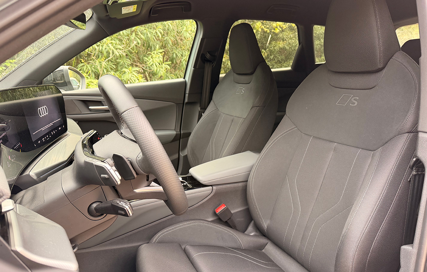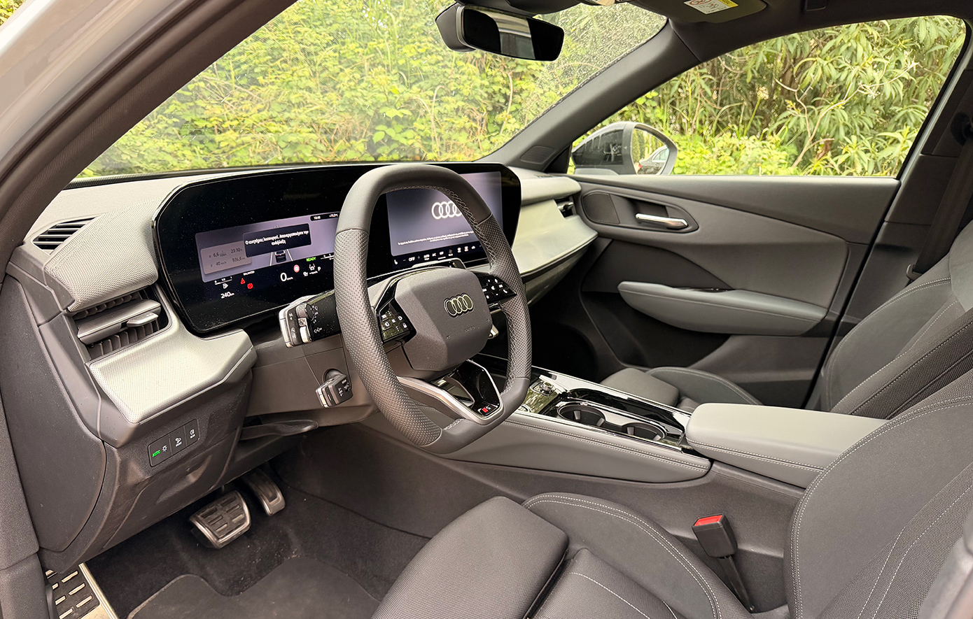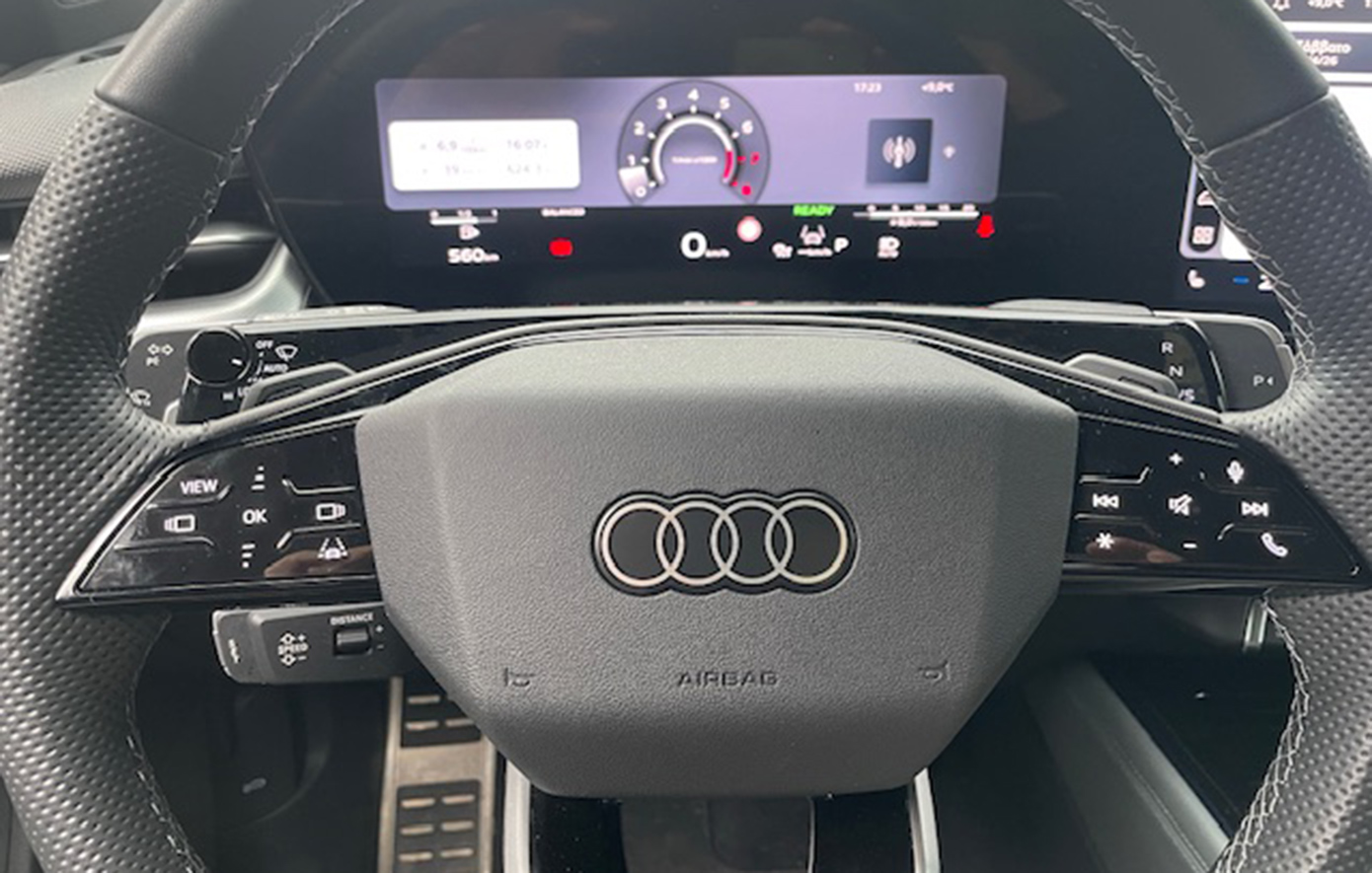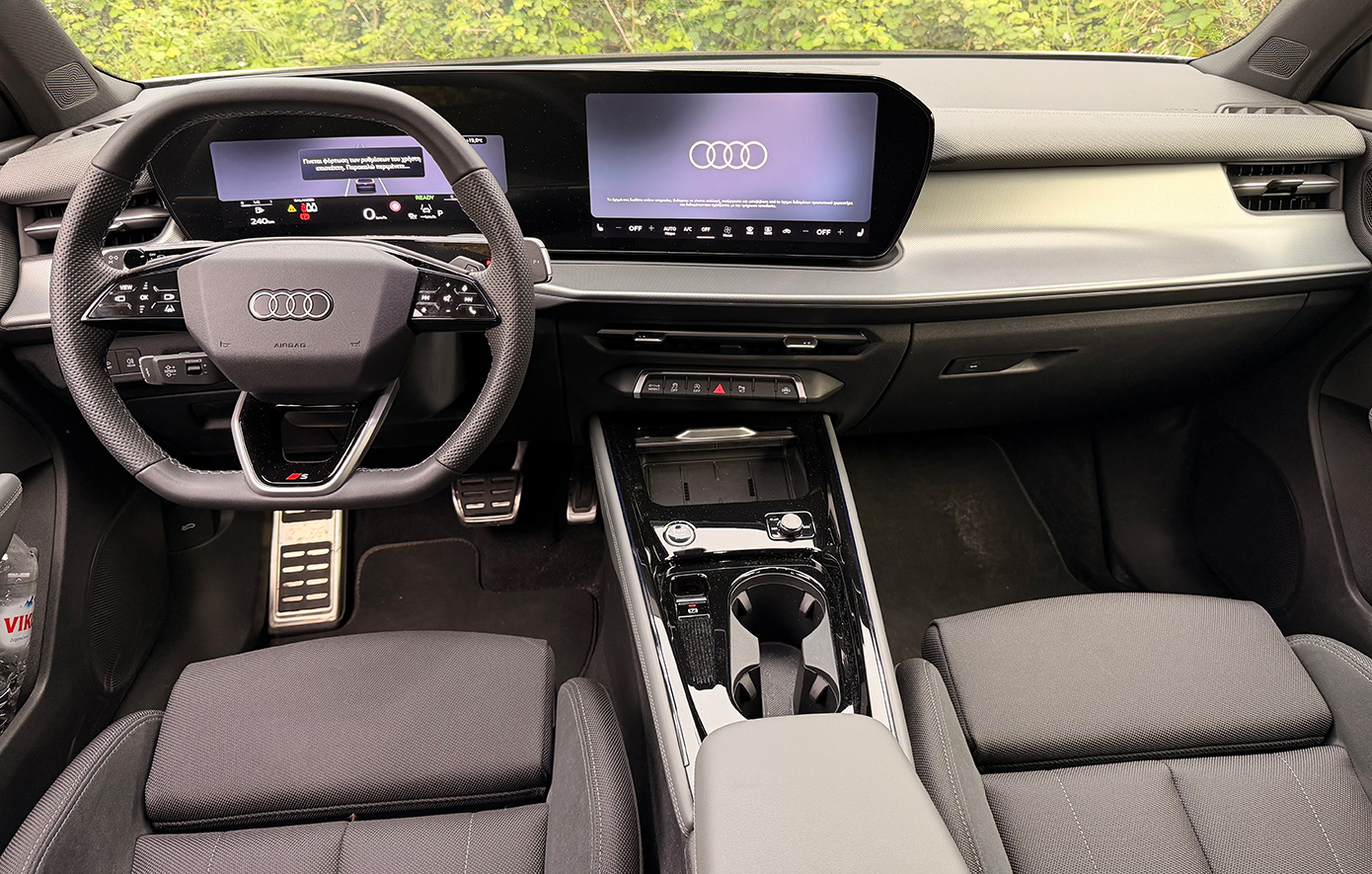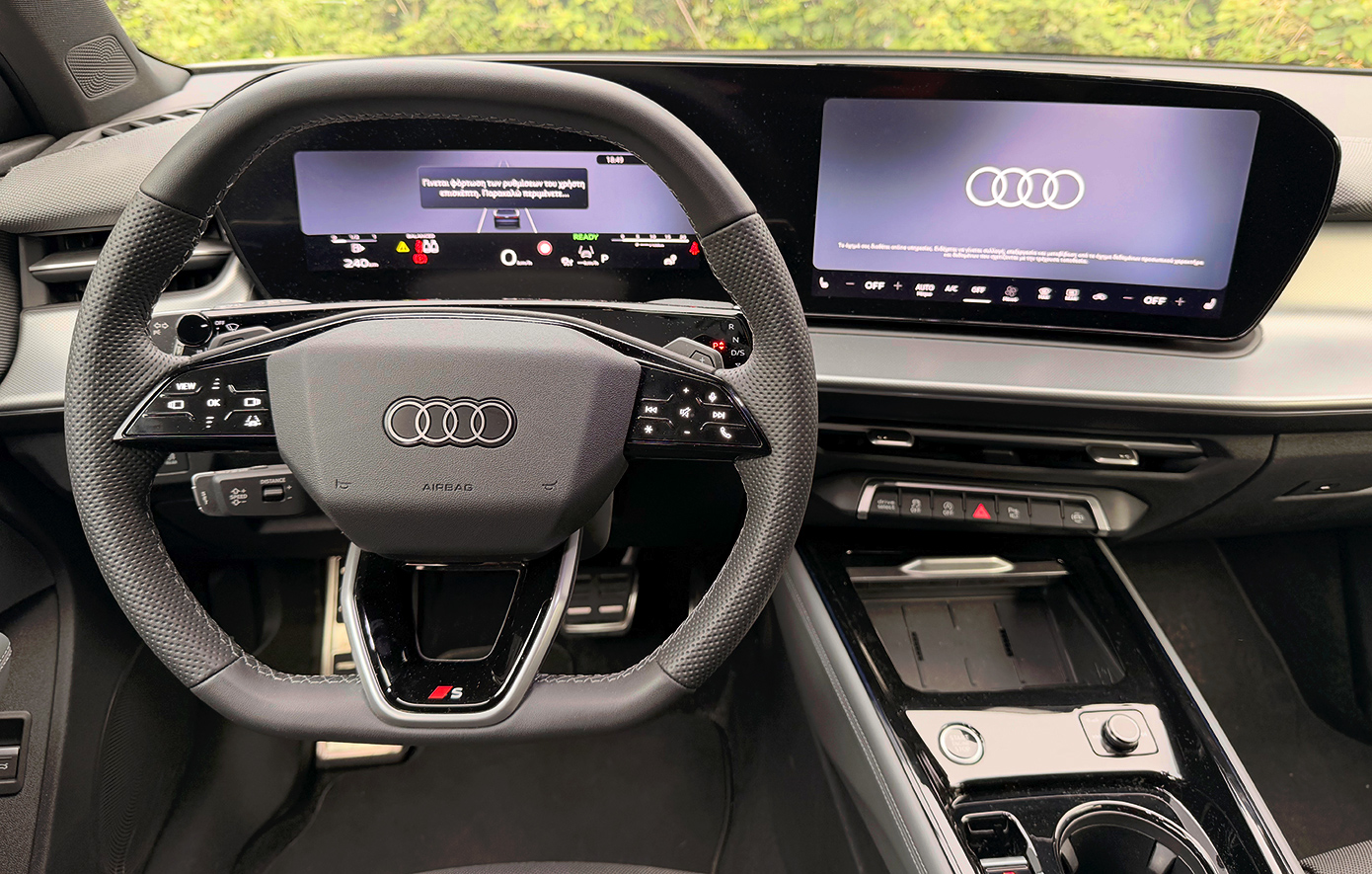 Όμως, τις εντυπώσεις στο εσωτερικό κλέβουν οι δυο ενσωματωμένες σε κυρτή επιφάνεια ψηφιακές οθόνες που αφορούν την ενημέρωση και την εξυπηρέτηση οδηγού και επιβατών. Ο πίνακας οργάνων 11,9” και η κεντρική οθόνη αφής 12,8”, είναι σε οδηγοκεντρική διάταξη, προσφέροντας άμεση πρόσβαση σε όλες τις βασικές πληροφορίες. Σημειώνω ότι, το infotainment MMI έχει αναβαθμιστεί με το Android Automotive OS προσφέροντας στον χρήστη εύκολο μενού, ενώ ενσωματώνει ψηφιακό βοηθό για φωνητικές εντολές.