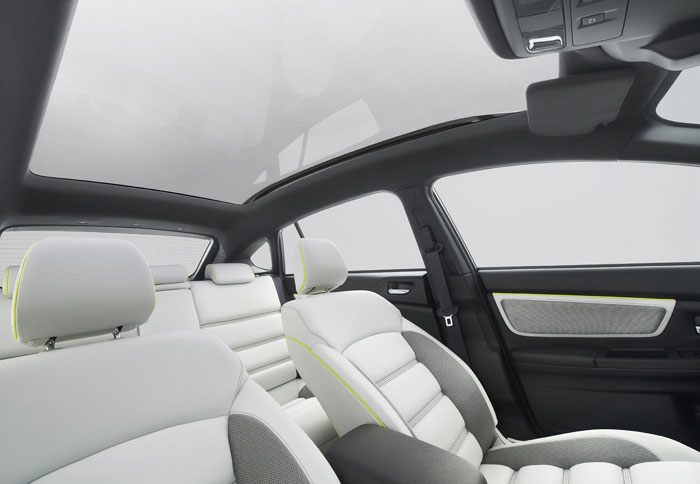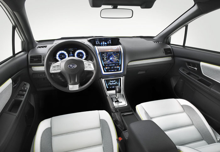 Στο εσωτερικό η διάταξη είναι διαφορετική από ότι έχουμε συνηθίσει στο Impreza (και εδώ θυμίζει Legacy Outback), και χαρακτηρίζεται από τις τρεις οθόνες που κυριαρχούν στην κεντρική κονσόλα. Η καθεμία από αυτές φιλοξενεί τις λειτουργίες του ηχοσυστήματος, του συστήματος πλοήγησης αλλά και πολλές πληροφορίες για το αυτοκίνητο, ενώ υπάρχει και μια ακόμη που προβάλλει ότι βλέπουν οι κάμερες του συστήματος EyeSight της Subaru! Το εξωτερικό του 5θέσιου XV concept είναι βαμμένο στο έντονο Electro Yellowgreen χρώμα των φωτογραφιών, ενώ τα καθίσματα στο εσωτερικό του φέρουν τις δερμάτινες επενδύσεις που η εταιρεία ονομάζει Silvery white leather.