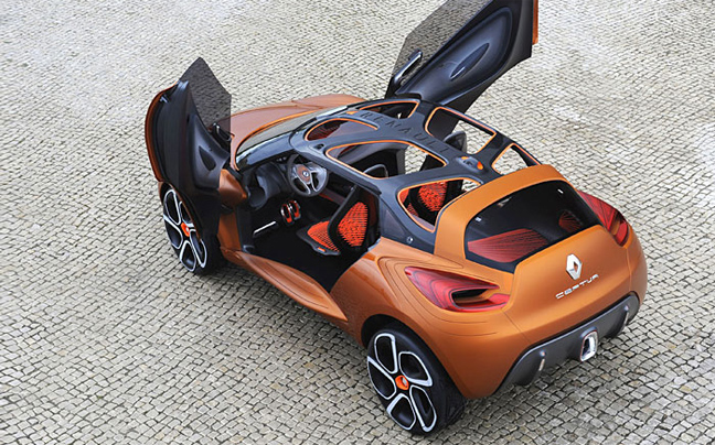 Η Renault θα αποκτήσει το δικό της Juke, το Captur. Εάν εξαιρέσουμε κάποιες στιλιστικές ακρότητες, το μέλλον του Captur είναι υπαρκτό: αυτό το crossover δεν είναι μόνο το δεύτερο στάδιο για το νέο image της Renault μετά το coupe DeZir, αλλά η ολοκληρωμένη ιδέα ενός νέου μοντέλου παραγωγής που θα παρουσιαστεί στα τέλη του 2012 ή στις αρχές του 2013. Σύμφωνα με το concept, αντιλαμβανόμαστε ότι θα είναι σχετικά περιορισμένες οι διαστάσεις του: 4 μέτρα και 22 εκ. μήκος, 1,95 μ. πλάτος και 1,59 μ. ύψος. Κατά τ´ άλλα, το Captur είναι ένα φαντασμαγορικό μοντέλο: διαθέτει δύο μόνο πόρτες, που ανασηκώνονται προς τα πάνω, καθώς και ουρανό κατασκευασμένο από Kevlar που, μάλιστα, μπορεί να αφαιρείται.