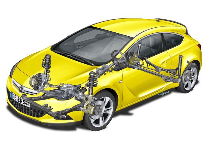 Συγκριτικά με το 5-θυρο Astra, η απόσταση αμαξώματος του GTC από το έδαφος έχει μειωθεί κατά 15 χιλ. ενώ το μεταξόνιο έχει αυξηθεί κατά 10 χιλ. (από 2685 χιλ. σε 2695 χιλ.). Τα δύο μετατρόχια είναι φαρδύτερα – 1584 χιλ. (+40χιλ.) μπροστά και 1585χιλ. (+30χιλ.) πίσω.