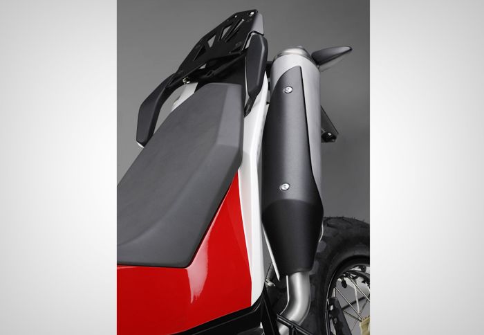 Όπως όμως φαίνεται και από τις φωτογραφίες το πλαίσιο είναι διπλής ραχοκοκαλιάς κλειστού τύπου και μοιάζει να είναι κατασκευασμένο από ατσάλι, το πιρούνι είναι ανεστραμμένο, οι δαγκάνες των φρένων προέρχονται από την Brembo και οι δίσκοι είναι κυματιστοί. Τέλος οι διαδρομές των αναρτήσεων μοιάζουν αρκετά μεγάλες και ο εμπρός τροχός είναι διαστάσεων 100/90/19”.