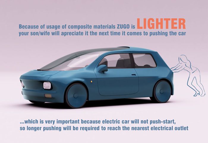To Ζastava Yugo 45 έγινε κάποτε δημοφιλές σε αγορές που προτιμήσουν τα value for money αυτοκίνητα. Στην αισθητική αυτού φαίνεται πως βασίστηκε ο ανεξάρτητος σχεδιαστής Milos Paripovic για να δώσει τη δική του ερμηνεία στη σύγχρονη ηλεκτρική εκδοχή του Yugo…την οποία και ονόμασε Zugo. Μάλιστα, ο ίδιος φαίνεται να διακωμωδεί το δημιούργημά του, τονίζοντας ότι το καινούριο ηλεκτρικό Zugo θα αποτελείται από ελαφριά υλικά, προκειμένου η σύζηγος ή ο γιος του ιδιοκτήτη όταν το σπρώχνουν μέχρι το πλησιέστερο σημείο ανεφοδιασμού με…ρεύμα!
