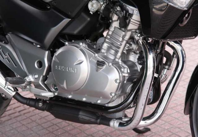 Το τιμόνι είναι τύπου κλιπ-ον, με τα γκριπ να δένουν πάνω από τις πλάκες. Η Suzuki δεν αμέλησε να περάσει με χρώμιο τις εξατμίσεις, και το σωλήνα της τρόμπας του ψυκτικού, δίνοντας μια αίσθηση πολυτέλειας στο Inazuma. Στην καρδιά της μοτοσικλέτας, βρίσκουμε ένα δικύλινδρο εν σειρά κινητήρας, με ηλεκτρονικό ψεκασμό και αισθητήρα «λ», για μέγιστη οικονομία καυσίμου -αλλά φυσικά και για τις προδιαγραφές ρύπων. Επιπλέον, ο στρόφαλος των 180ο διαθέτει αντικραδασμικό άξονα, για ελαχιστοποίηση των κραδασμών.