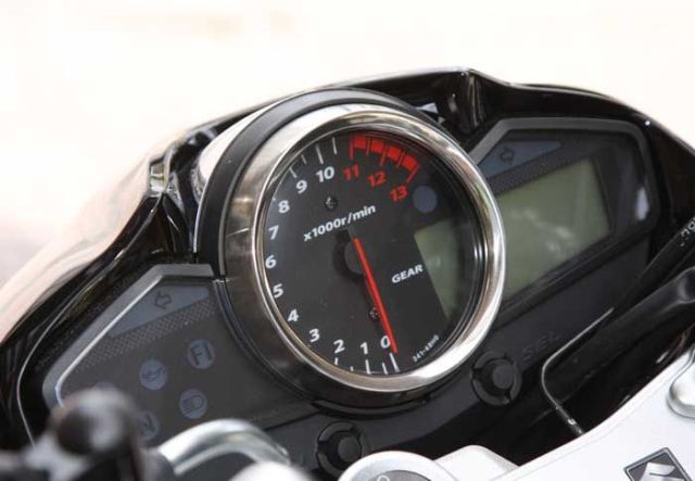 Στο κέντρο βρίσκεται ένα αναλογικό στροφόμετρο που δείχνει έως και 13.000σαλ, ενώ υπάρχει και ψηφιακή οθόνη, χωρισμένη στα δύο. Στο ένα μέρος της βρίσκουμε ένδειξη ταχύτητας κιβωτίου, και στο άλλο έχουμε ενδείξεις κοντέρ, βενζίνης, ρολόι, 2 χιλιομετρητές, ένδειξη για service και άλλα.