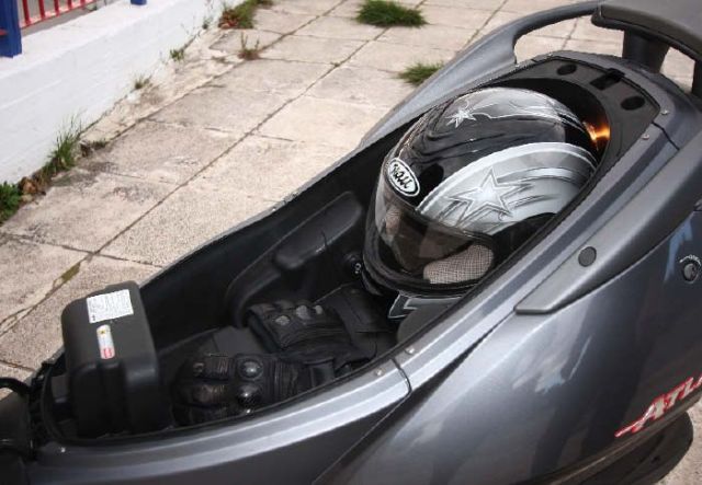 Κάτω από τη σέλα κρύβεται ένα από τα δυνατότερα ατού του Atlantic: οι αποθηκευτικοί χώροι. Εκεί θα φιλοξενηθεί με άνεση ένα full face κράνος, καθώς και αρκετά πράγματα, ενώ υπάρχει και υποδοχή ρεύματος για τη φόρτιση κινητού, όπως και φωτισμός. Λοιπά μικροπράγματα θα φιλοξενηθούν στο ντουλαπάκι της ποδιάς, το οποίο είναι αρκετά βαθύ, ενώ ο γάντζος μπορεί να μεταφέρει μια τσάντα μεγάλων διαστάσεων.