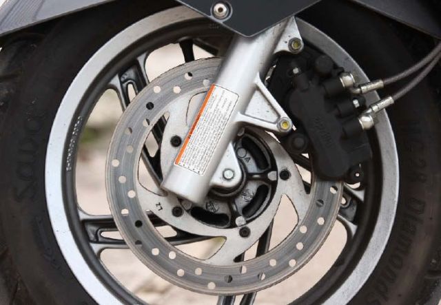 Το σύστημα πέδησης του Atlantic 300 καταφέρνει, χωρίς πολλά-πολλά, να ελέγξει τις επιβραδύνσεις και ακινητοποιήσεις που απαιτούνται στην πόλη, αλλά και έξω από αυτή. Μπροστά συναντάμε ένα δίσκο 240 χλστ. με πλευστή δαγκάνα τριών εμβόλων, ενώ πίσω, ο δίσκος των 190 χλστ. δέχεται την πίεση μιας μονοέμβολης δαγκάνας.