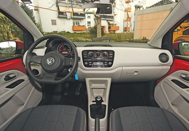 To εσωτερικό του up! διακρίνεται για την απλή του σχεδίαση, αλλά και για την πολύ καλή του εργονομία σε ό,τι αφορά στους διακόπτες και τα χειριστήρια στο ταμπλό. Από την άλλη βέβαια δεν λείπουν κάποια ατοπήματα, όπως κυρίως ο χειρισμός του κάθε παραθύρου μόνο από ένα διακόπτη σε κάθε πλευρά του αυτοκινήτου.
