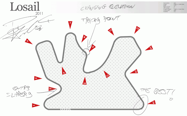 Βλέπουμε στο μπάσκετ τους προπονητές να αποτυπώνουν τις οδηγίες τους πάνω σε ένα ομοίωμα του γηπέδου. Το ίδιο κάνουν και οι οδηγοί του motoGP καθώς σημειώνουν με τους μηχανικούς τους τις πληροφορίες που θέλουν, στο δικό τους γήπεδο, την εκάστοτε πίστα.