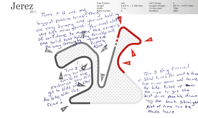 Σημεία όπου χρειάζονται ιδιαίτερη προσοχή, άλλα όπου κερδίζουν χρόνο, αυτά που είναι απαιτητικά από τη μοτοσυκλέτα και τα ελαστικά. Οι πληροφορίες αυτές συνδυάζονται με τους χρόνους στα αντίστοιχα τμήματα της πίστας, και αναλόγως οδηγούνται σε διαφορετικές ρυθμίσεις στις αναρτήσεις και τα ηλεκτρονικά βοηθήματα.