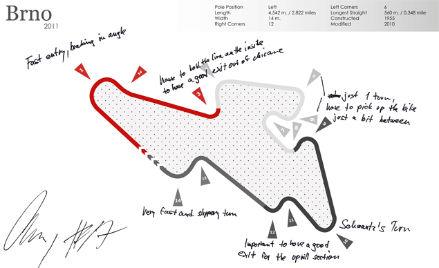 Ο Karel Abraham σημειώνει στην 12η στροφή της πίστας του Brno στην Τσεχία, ότι είναι σημαντική μια καλή έξοδος για το επερχόμενο ανηφορικό τμήμα, ενώ ο John Hopkins σημειώνει στην έκτακτη συμμετοχή του στο Jerez της Ισπανίας ότι στην 5η στροφή μπορείς να κερδίσεις πολύ χρόνο.