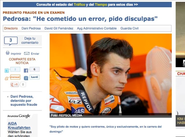 Ο αναβάτης της Repsol Honda έχει ήδη δώσει στη δημοσιότητα απολογητική επιστολή προς τους θαυμαστές του. Όλα ξεκίνησαν όταν συνελήφθη από την Guardia Civil, επειδή προσπάθησε να αντιγράψει, κατά τη διάρκεια των εξετάσεων για δίπλωμα ταχύπλοου.