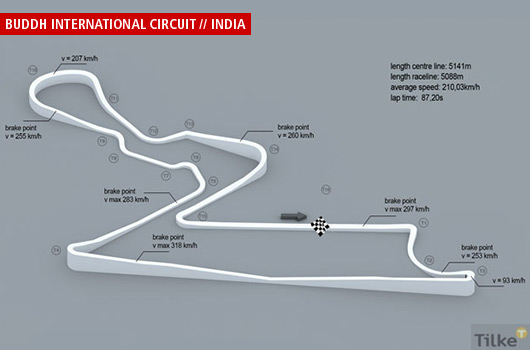 Η πίστα Buddh International Circuit είναι η νεότερη στον κόσμο αφού εγκαινιάστηκε επίσημα μόλις τον Οκτώβριο του 2011. Είναι μία από τις πιο γρήγορες σε σχεδίαση και η πληρέστερη σε παροχές και δυνατότητες που έχει φτιαχτεί ποτέ.