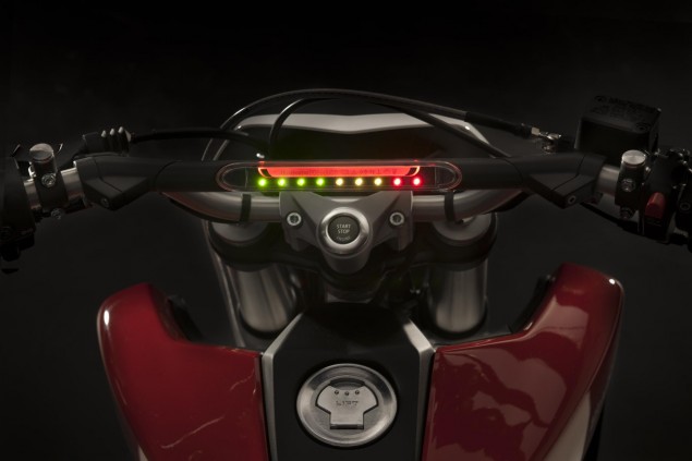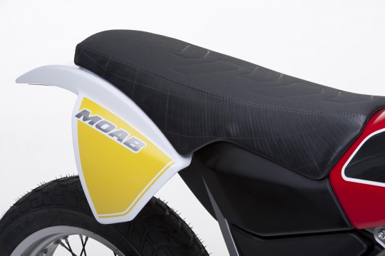 To κόκκινο ρεζερβουάρ, η ευρύχωρη σέλα, τα κίτρινα πλευρικά number plates, το λιτό ευθύγραμμα πλαίσιο, όλα έχουν κάτι από την αύρα της ιστορίας και ενσαρκώνουν την άποψη της Husqvarna. Παράδοση και καινοτομίες συνδυάζονται αρμονικά στις λεπτομέρειες του Concept MOAB: τα ψηφιακά όργανα, ο πρωτοποριακός προβολέας που η τεχνολογία LED του επιτρέπει να ‘κρύβεται’ πίσω από την πινακίδα στο πιρούνι και το πίσω φωτιστικό σώμα.