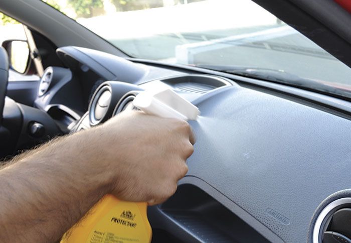 2. Αφού καθαρίσουμε από τη σκόνη κάθε τμήμα του ταμπλό, ψεκάζουμε προσεκτικά μικρές επιφάνειες και από απόσταση περίπου 20 εκατοστών. Στη συνέχεια αφήνουμε το υγρό για λίγα δευτερόλεπτα ώστε να απορροφηθεί, ιδιαίτερα στα μαλακά πλαστικά.