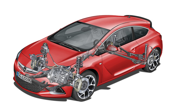 Σε ότι αφορά στην απόσβεση της ανάρτησης, συγκριτικά με το υπερτροφοδοτούμενο 1.6 Astra GTC των 180 ίππων, οι μηχανικοί του εταιρείας σκλήρυναν τα στάνταρ ελατήρια κατά περίπου 30% και χαμήλωσαν το αυτοκίνητο κατά 10 χλστ. Επίσης, τα οι ελαστικοί σύνδεσμοι της ανάρτησης και ο πίσω άξονας έγιναν πιο άκαμπτα, για μεγαλύτερη ευελιξία και απόκριση στη σπορ οδήγησης. Συν τοις άλλοις, το σύστημα ελέγχου ευστάθειας του αμαξώματος (ESP) προσφέρει επίσης τρία διαφορετικά προγράμματα, ανάλογα με τη διάθεση του οδηγού. Πέρα από τη στάνταρ ρύθμιση, ο οδηγός μπορεί να επιλέξει το competitive mode, στο οποίο παρέχονται αρκετές αλλά όχι όλες οι… ελευθερίες, κάτι που σε αντίθεση ισχύει στο πρόγραμμα off mode, πιέζοντας το μπουτόν του ESP πάνω από πέντε δευτερόλεπτα.