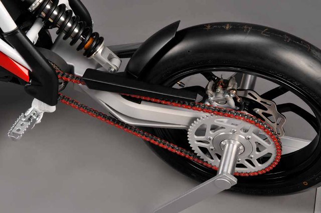 Διακρίνεται ο ιμάντας που δίνει κίνηση στο εμπρός γρανάζι της τελικής μετάδοσης. Την συνέχεια της μετάδοσης αναλαμβάνει αλυσίδα και μάλιστα κόκκινη, όπως είναι και σε αρκετά μοντέλα της Husqvarna.