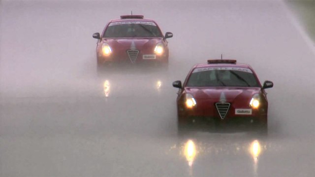 Μετά από τους 3 γύρους αποκολλάται το πέλμα! Έτσι, όταν η στάθμη του νερού από τη βροχόπτωση ξεπέρασε το όριο χρήσης χαραγμένων σλικ ελαστικών -οπότε θα έπρεπε να φορεθούν τα βροχής- οι επιλογές ήταν τρεις: Να χρησιμοποιηθούν τα λάστιχα βροχής για τρεις μόνον γύρους και μετά να τερματιστεί ο αγώνας, να αλλάζουν κάθε τρεις γύρους λάστιχα οι αναβάτες (αστείο, αφήστε που δεν είχε τόσα λάστιχα η Pirelli) ή να ακυρωθεί το σκέλος λόγω επικινδυνότητας.