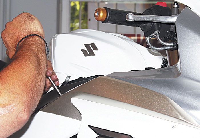 2. Αφαιρέστε το κομμάτι του φέρινγκ που κρύβει το ψυγείο, ώστε να μπορέσετε να ελέγξετε τη στάθμη του παραφλού και, αν χρειαστεί, να συμπληρώσετε. Προσέξτε τον τρόπο που ήταν τοποθετημένο το κομμάτι που αφαιρέσατε, ώστε να το ξαναβάλετε πίσω εύκολα.