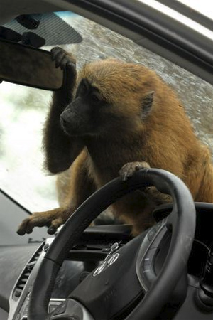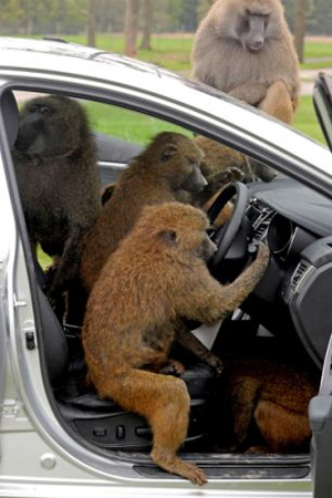 Μπορεί να μη ρωτάνε «πότε φτάνουμε;» αλλά κατά τα άλλα οι περίπου σαράντα μπαμπουίνοι δεν άφησαν ούτε ένα εκατοστό του οχήματος ανεξερεύνητο. Πηδούσαν στα καθίσματα, έβγαιναν από την ηλιοροφή, πάτησαν κάθε κουμπί και δοκίμασαν τη… γεύση των μαξιλαριών των καθισμάτων.