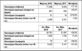 Συνολικά, στο τρίμηνο Ιανουαρίου-Μαρτίου 2018 οι ταξινομήσεις καινούργιων επιβατικών είναι αυξημένες κατά +26,9% ως προς το αντίστοιχο διάστημα του 2017.