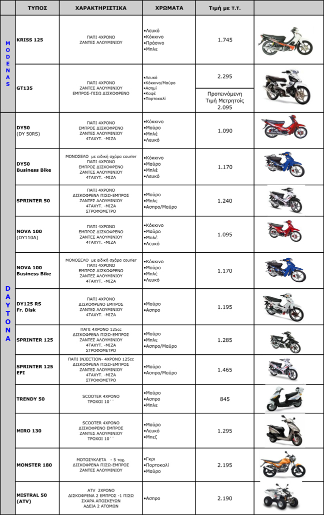 Μεγάλη ποικιλία μοντέλων σε παπιά κυρίως αλλά και scooter και ATV προφέρουν οι ελληνικών συμφερόντων εταιρείες, Modenas και Daytona.