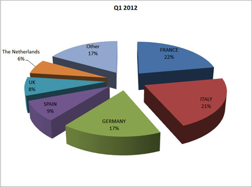 Στη σειρά μεγέθους, η Γαλλία εδραιώνεται ως η μεγαλύτερη αγορά της γηραιάς ηπείρου, θέση που παρέλαβε από την Ιταλία το 2011. Η αλλαγή φρουράς στην κορυφή απλά καταδεικνύει τις μεγάλες και βίαιες δομικές αλλαγές τις οποίες υφίσταται ο τομέας των μηχανοκίνητων δικύκλων.