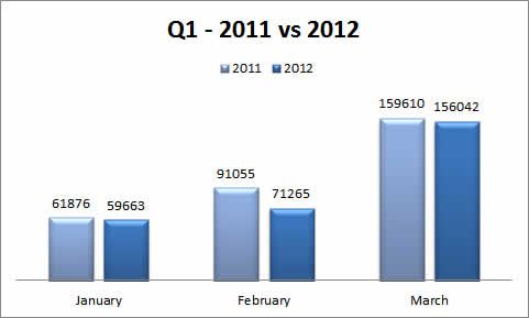 Μοναδική νότα αισιοδοξίας για την Ευρωπαϊκή αγορά ήρθε από την ελαφρά ανάκαμψη του Μαρτίου. Τον τρίτο μήνα διπλασιάστηκαν τα -λιγοστά- τεμάχια του Φεβρουαρίου –οπότε οι πωλήσεις σημείωσαν κάμψη κατά 14,4% σε σχέση με τον Μάρτιο του 2011.