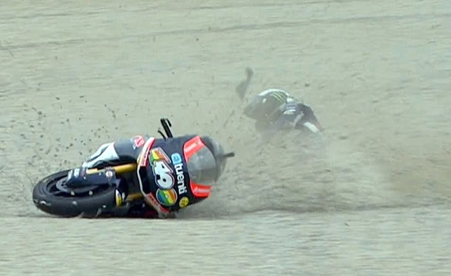 Σε κατάσταση ανισορροπίας ακόμα ο Marquez προσπάθησε να επιστρέψει στη γραμμή του -καθώς είχε ανοιχτεί κατά την εξέλιξη του συμβάντος- και εκεί μπλόκαρε τον Espargaro που είδε την τρύπα και προσπάθησε να χωθεί για να περάσει. Ακούμπησαν, ο Pol πάτησε στο βιράζ, γλίστρησε, έχασε το μπροστινό του και έπεσε.