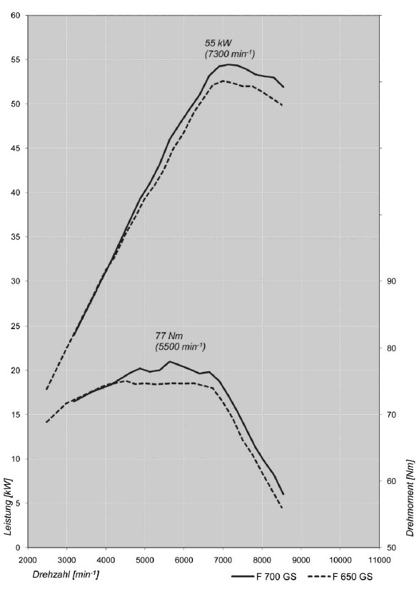 Οι τιμές της ισχύος και ροπής για το “μεγάλο” μοντέλο, το F 800 GS, έχουν παραμείνει ως είχαν, στους 85 ίππους στις 7.500 σαλ, και στα 8,5 kgm στις 5.750 σαλ αντίστοιχα.