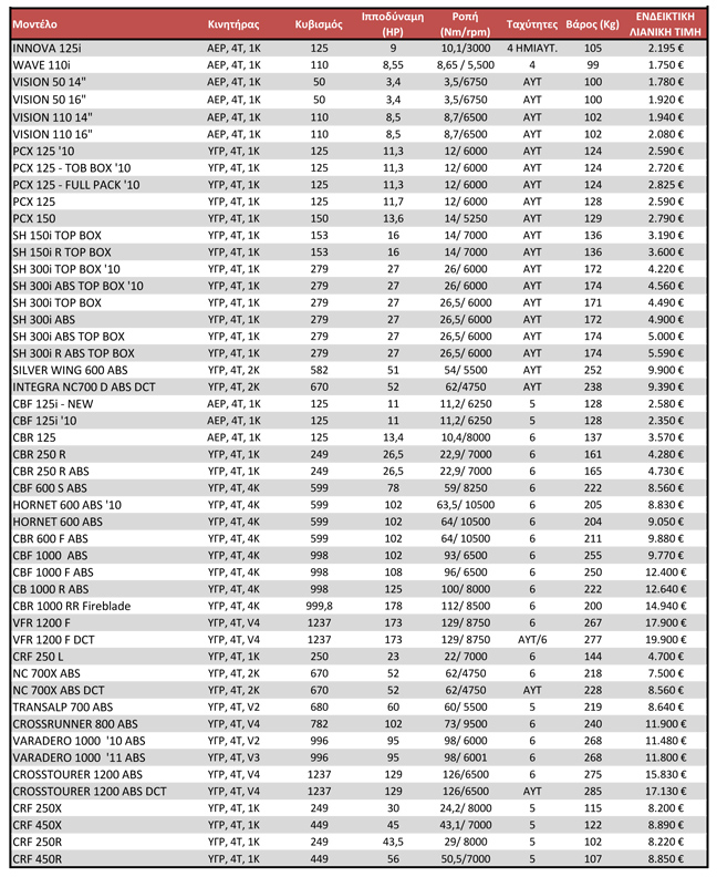 Στο νέο τιμοκατάλογο της Honda ξεχωρίζουν το νέο PCX 150 που αποτελεί συνέχεια του ιδιαίτερα επιτυχημένου PCX 125 και το νέο μικρό on-off της εταιρείας, το νέο CRF 250 L.